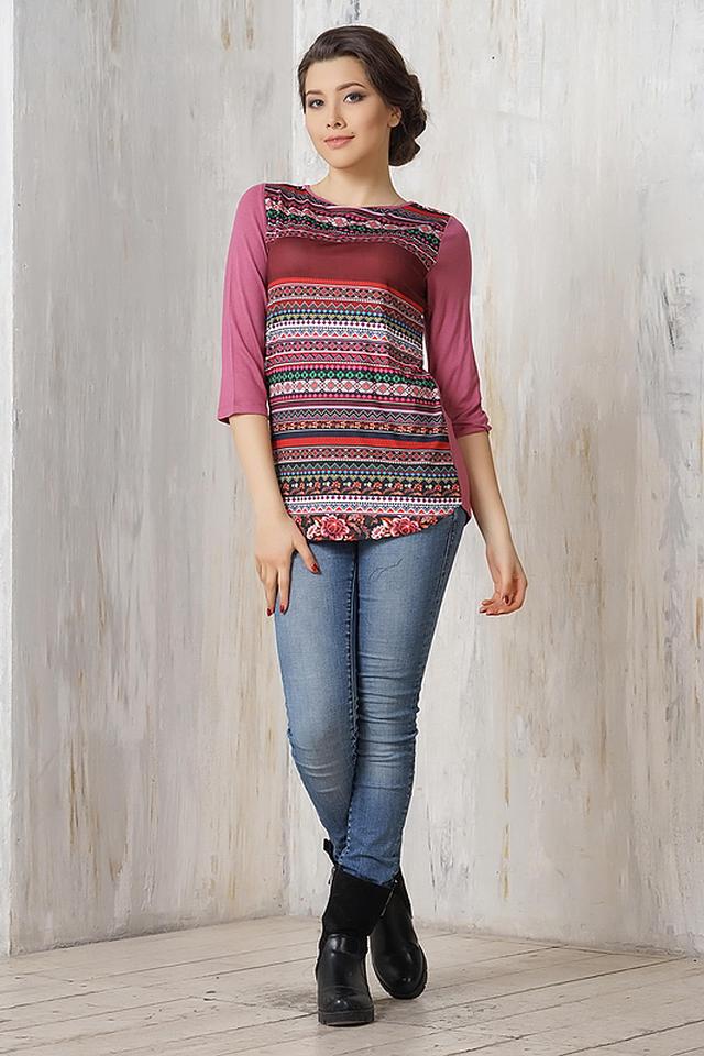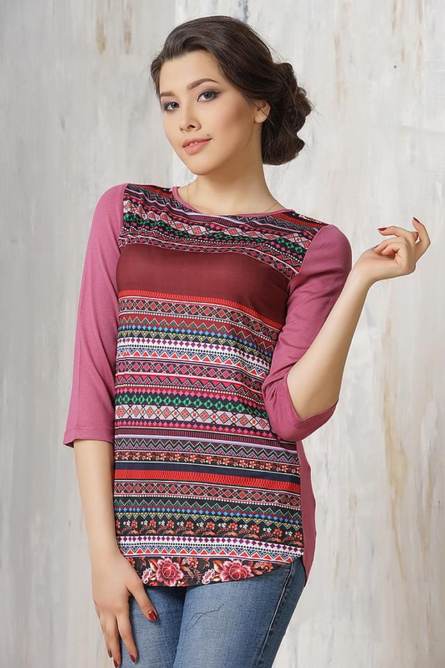 Блуза имеет свободный крой, рукава длиной 3/4 и округлый вырез горловины. Основной цвет блузы – бордовый, а передняя часть украшена красочным этническим принтом, выполненным в разнообразных оттенках.