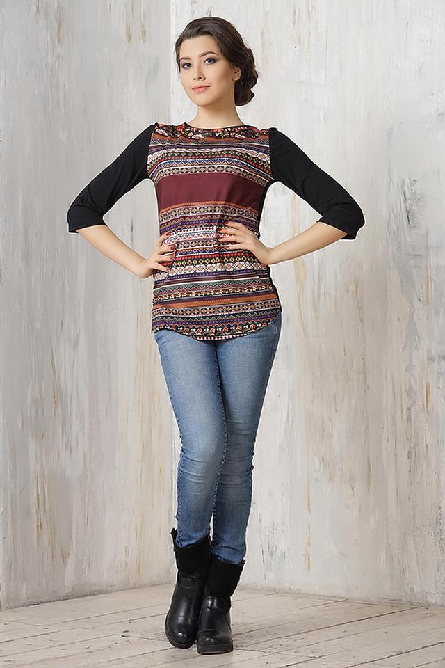 Рукава блузы – три четверти, что делает ее универсальной для разных сезонов. Принт выполнен в насыщенных оттенках красного, бордового, оранжевого, синего и коричневого цветов, создавая неповторимый и запоминающийся образ.