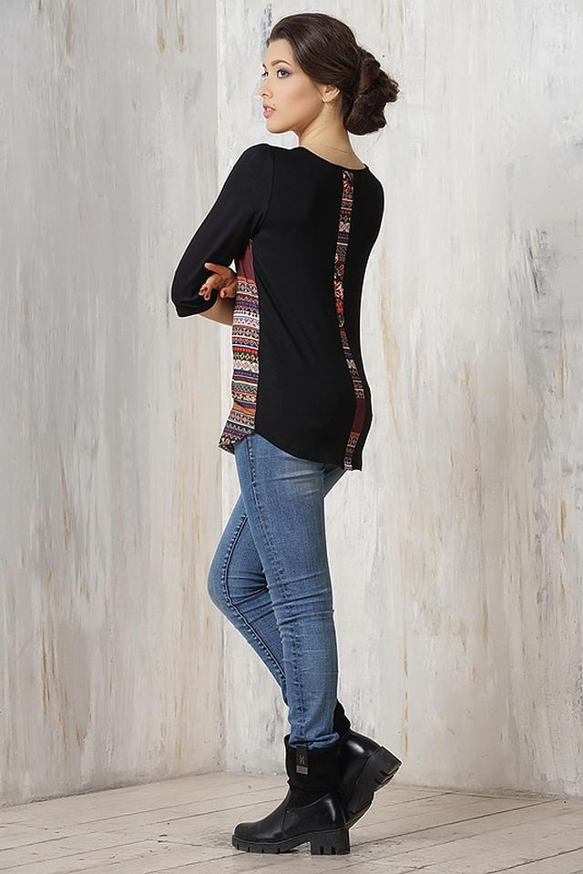 Эта блуза от VAY станет ярким акцентом в вашем гардеробе. Модель сочетает в себе черный цвет верха и рукавов с красочным этническим принтом на основной части. Блуза выполнена из приятной к телу вискозы с добавлением эластана, что обеспечивает комфорт при носке и хорошую посадку по фигуре.