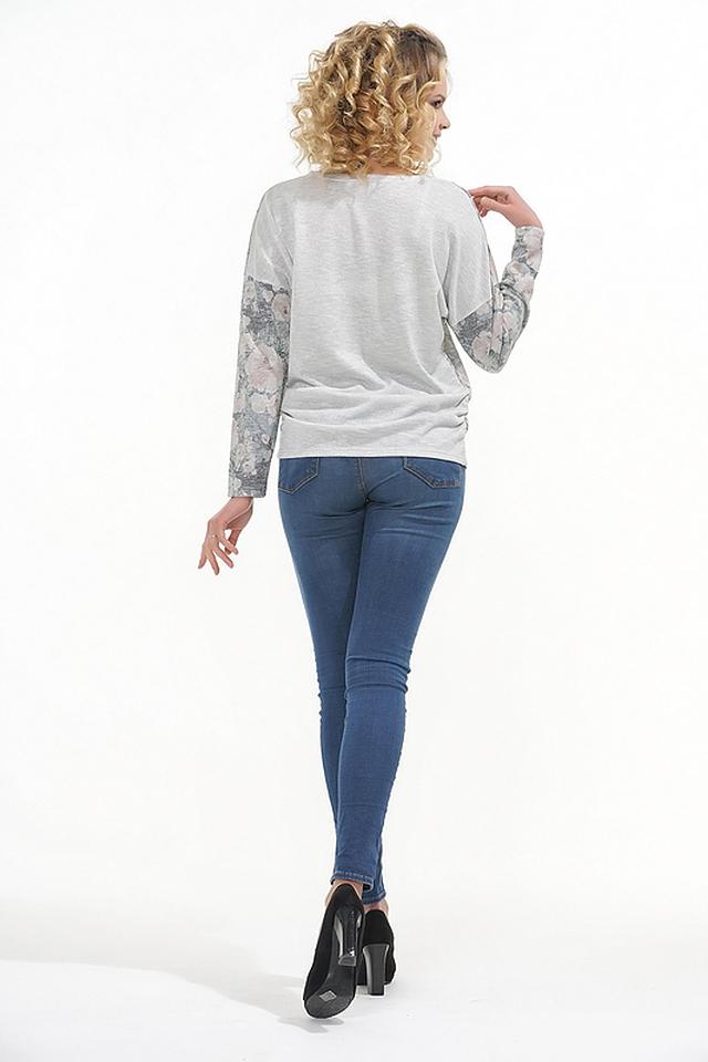 - Романтичный дизайн: Крупный цветочный принт в розовых и серых оттенках добавляет образу женственности и легкости. Широкая круглая горловина изящно подчеркивает линию шеи и ключиц.
