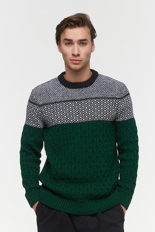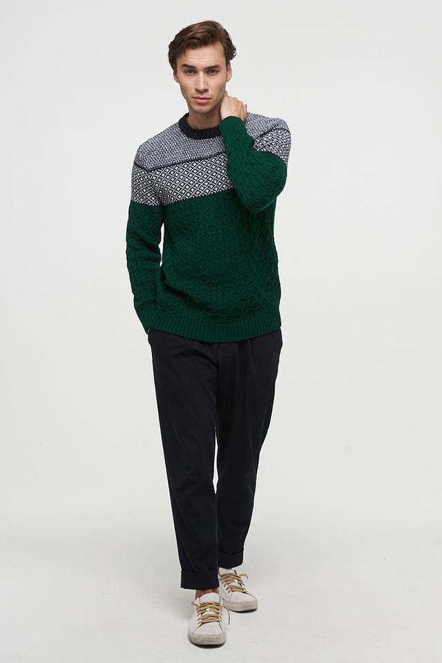 Джемпер VAY – это стильное и практичное решение для создания комфортного образа. Модель выполнена в зелёном цвете и украшена геометрическим жаккардовым узором на плечах, выполненным в белых и тёмно-синих тонах.