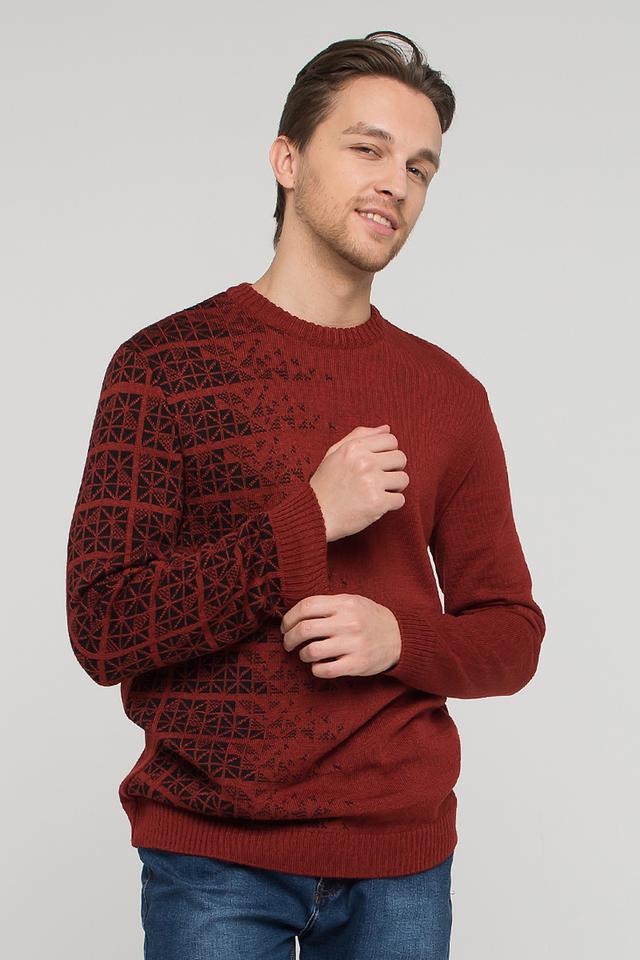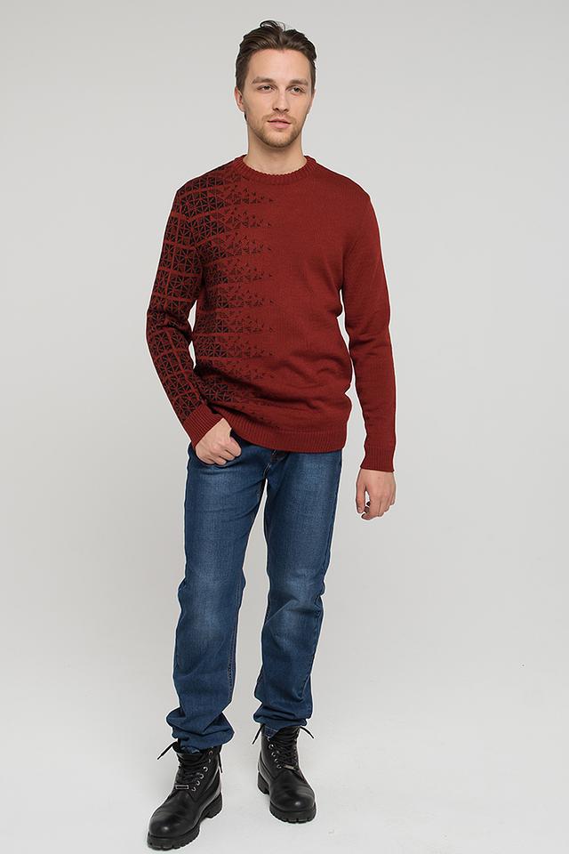 Этот стильный мужской джемпер от VAY станет отличным дополнением к вашему гардеробу. Выполненный в насыщенном бордовом цвете, он привлекает внимание своим оригинальным жаккардовым узором, расположенным на рукавах и груди.