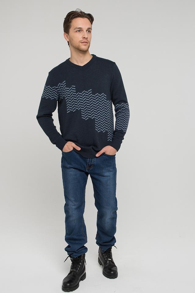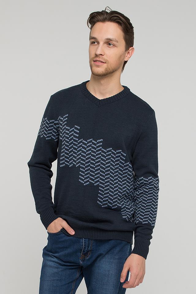 Мужской джемпер VAY тёмно-синего цвета с оригинальным геометрическим узором. Изготовлен из мягкого и приятного к телу сочетания хлопка и шерсти, обеспечивающего комфорт и тепло. Идеально подходит для создания стильного повседневного образа. Состав: пан 70%, шерсть 30%