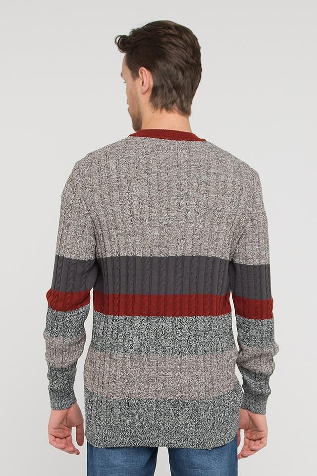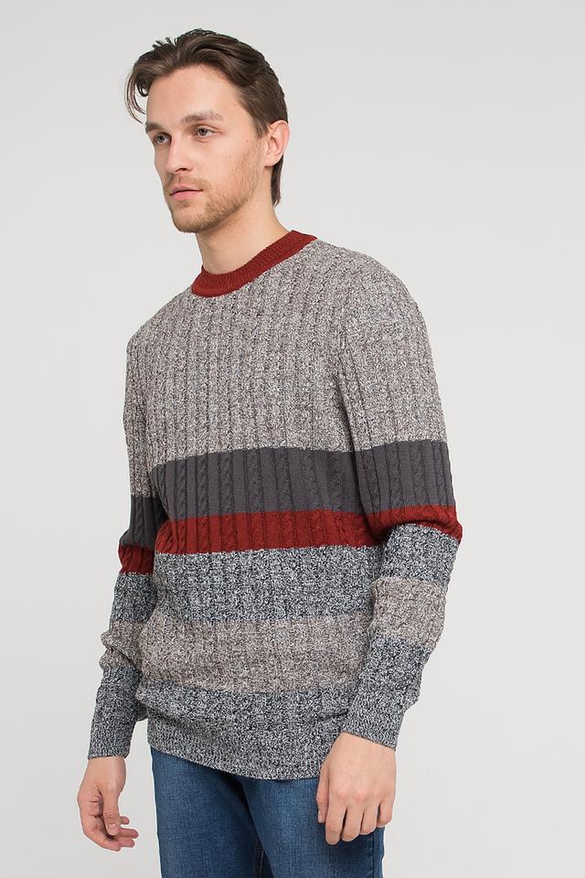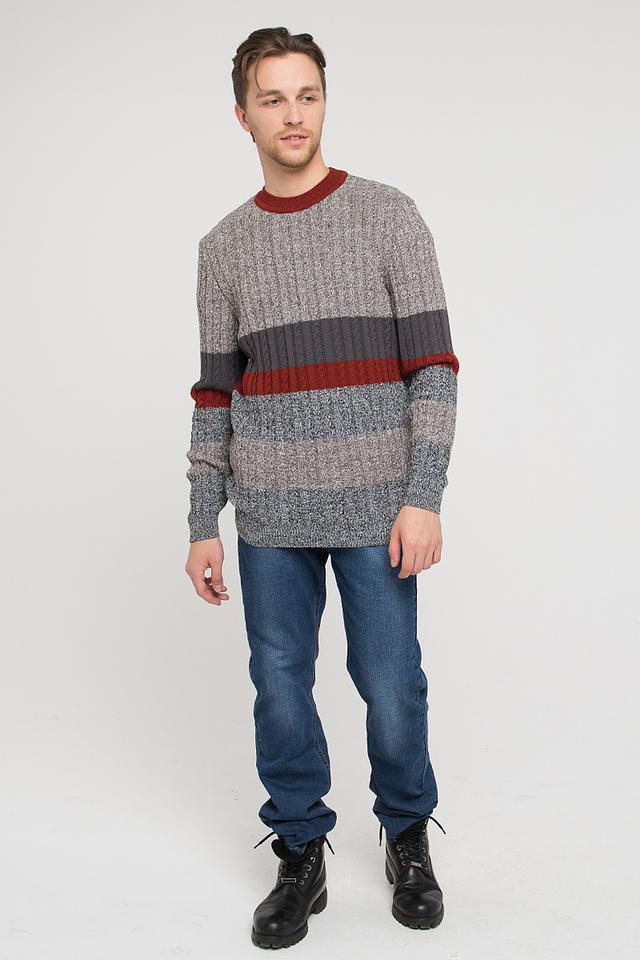 Дизайн джемпера включает горизонтальные полосы в сером, бордовом и графитовом цветах, создающие интересный визуальный эффект. Круглый вырез горловины и длинные рукава обеспечивают комфортную посадку. Текстура вязки – рельефная, с косами на полосках.