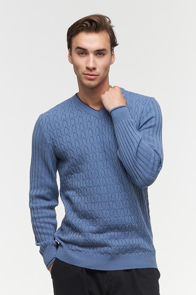 Мужской джемпер VAY голубого цвета с V-образным вырезом и текстурным узором в виде кос. Изготовлен из сочетания шерсти и хлопка, обеспечивая комфорт и тепло. Идеально подходит для создания стильного повседневного образа. Состав: пан 70%, шерсть 30%