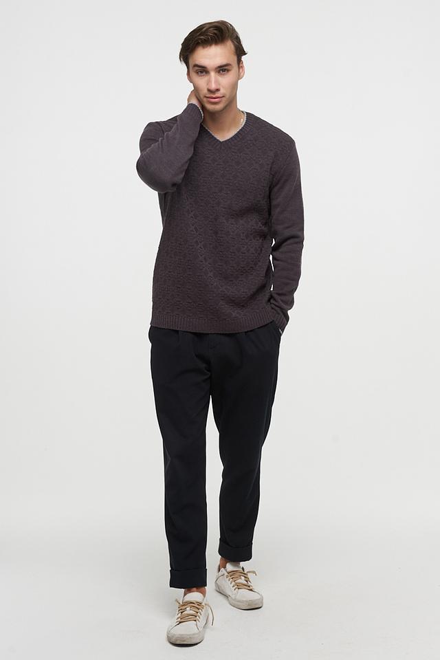 Мужской джемпер VAY серого цвета с V-образным вырезом и геометрическим узором. Изготовлен из мягкой шерсти и пан, обеспечивающей комфорт и тепло. Идеально подходит для создания стильного повседневного образа. Состав: шерсть 50%, пан 50%