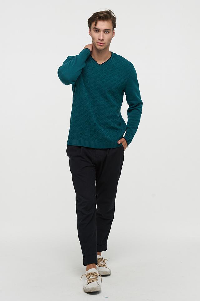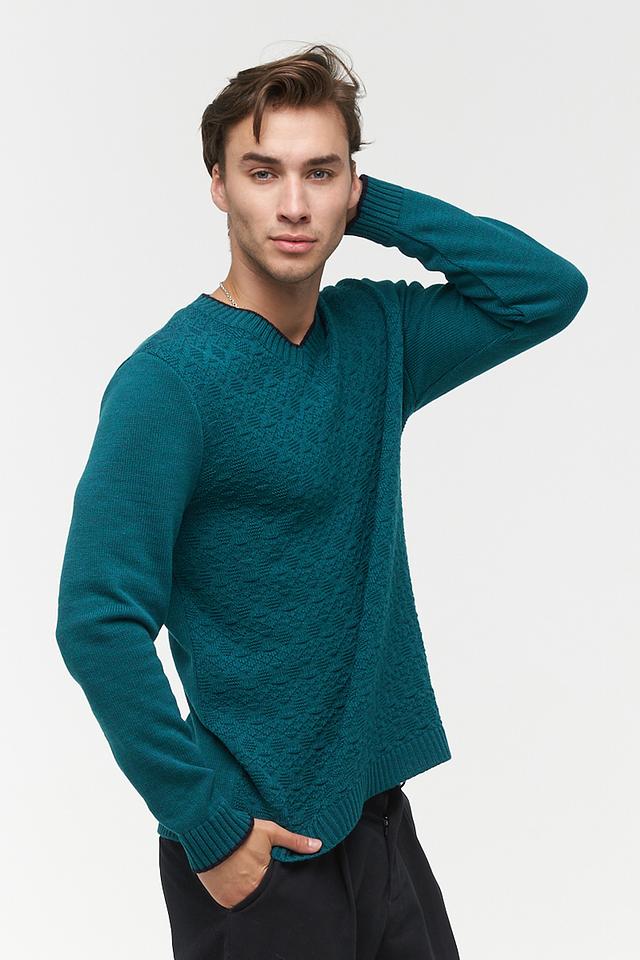 Мужской пуловер VAY изумрудного цвета с V-образным вырезом и текстурным плетением. Изготовлен из мягкой смеси шерсти и пан, обеспечивающей комфорт и тепло. Идеальный выбор для создания стильного и уютного образа. Состав: шерсть 50%, пан 50%