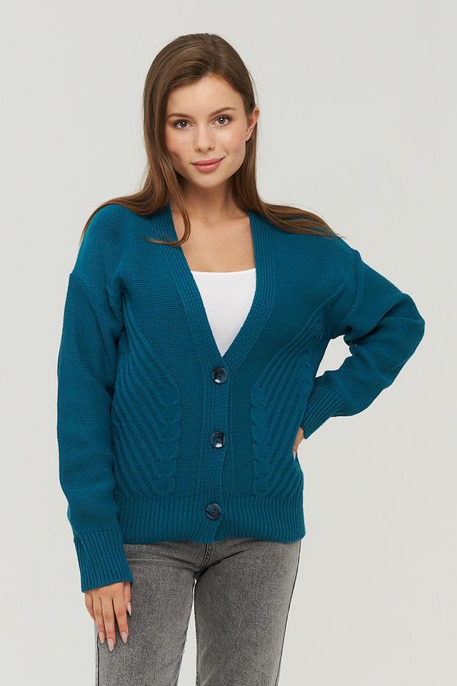 Модель имеет классический крой, V-образный вырез и застежку на пуговицы. Передняя часть кардигана украшена рельефным узором в виде кос, добавляющим изделию текстуру и стиль.
