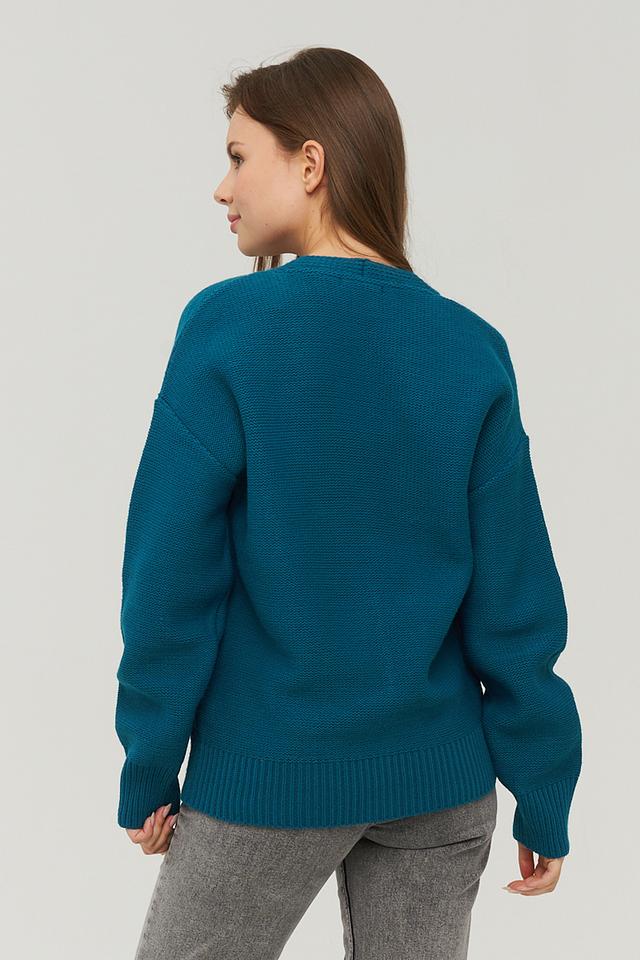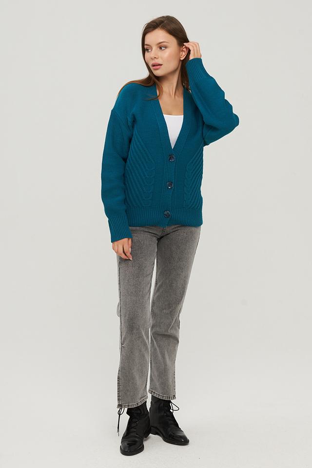 Длинные рукава и прямой силуэт делают этот кардиган универсальным элементом гардероба, который легко сочетается с различными стилями одежды. Изумрудный цвет придаёт образу свежесть и элегантность.