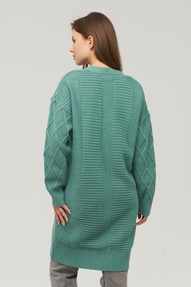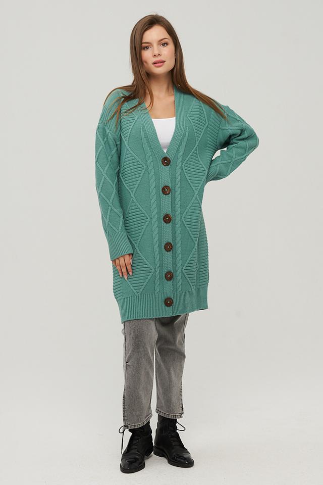 Кардиган имеет удлиненный силуэт и свободный крой, что позволяет создавать различные образы – от повседневных до более элегантных. Выразительный узор "косы" добавляет изделию текстуру и визуальный интерес.