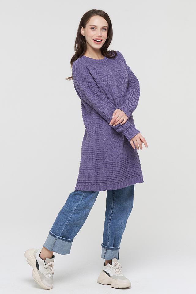 Джемпер отличается рельефной фактурой вязки, создающей интересный визуальный эффект. Удлиненный силуэт позволяет носить его как самостоятельный элемент одежды, так и в сочетании с леггинсами или джинсами.
