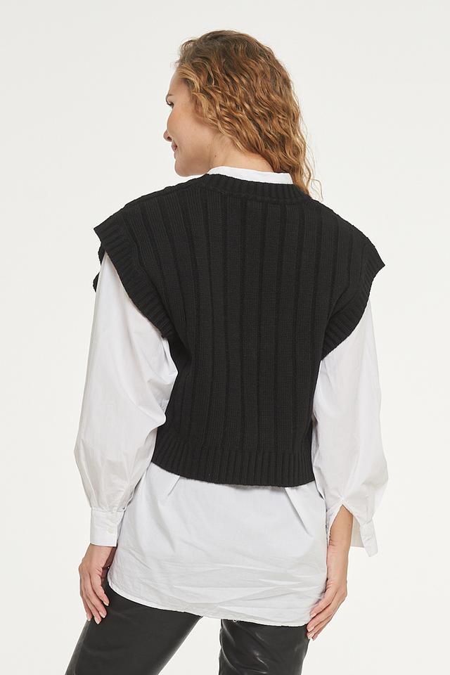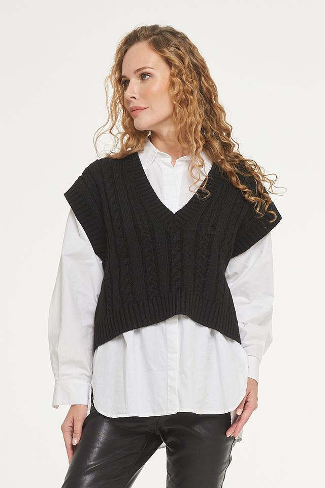 Жилет имеет классический чёрный цвет и V-образный вырез. Укороченный крой делает его идеальным для создания модных многослойных образов. Текстура вязаного полотна добавляет изделию объём и фактурность.