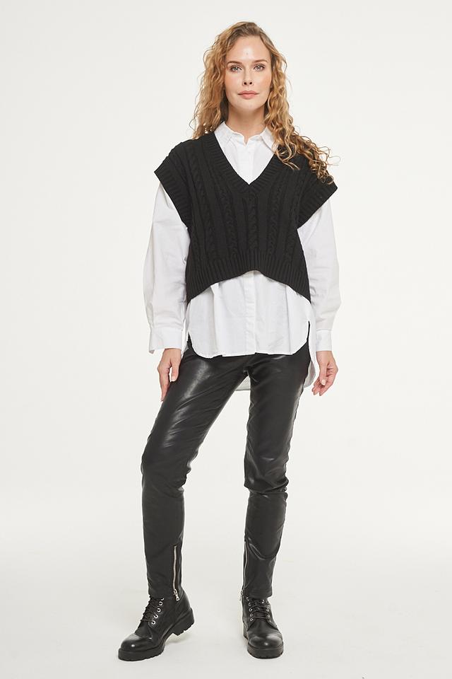 Чёрный жилет VAY из вязаного полотна — стильный и универсальный элемент гардероба. Модель выполнена с V-образным вырезом и укороченным кроем, что позволяет создавать модные многослойные образы. Состав: пан 70%, шерсть 30%