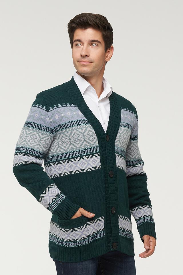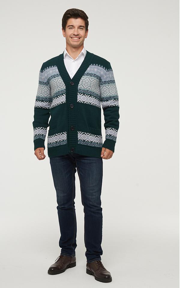 Мужской кардиган VAY зелёного цвета с традиционным жаккардовым узором. Модель выполнена из мягкой смеси шерсти и пана, имеет V-образный вырез и застёжку на пуговицы. Состав: пан 70%, шерсть 30%