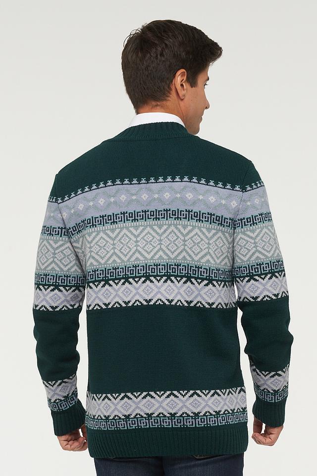 Мужской кардиган от бренда VAY – это стильное и комфортное решение для прохладной погоды. Изделие выполнено в насыщенном зелёном цвете и украшено классическим жаккардовым узором в серо-белой гамме.