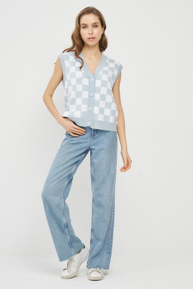 Женский жилет VAY голубого цвета выполнен в клетку и застегивается на пуговицы. Модель имеет V-образный вырез и прямой крой, идеально подходит для создания многослойных образов. Состав: хлопок 50%, пан 50%