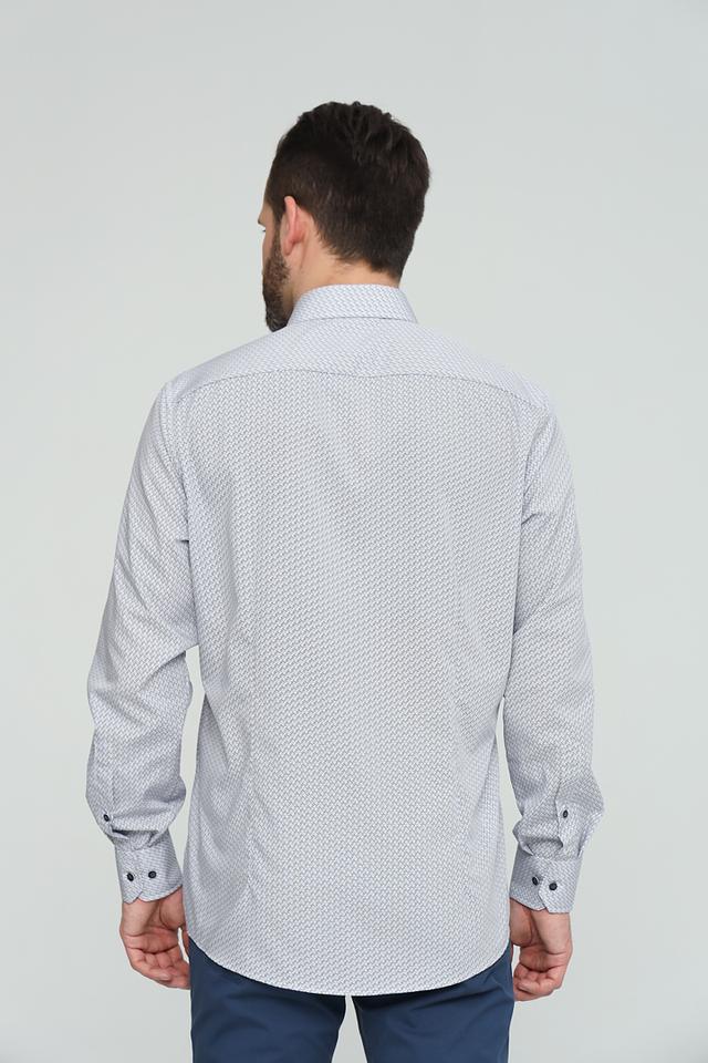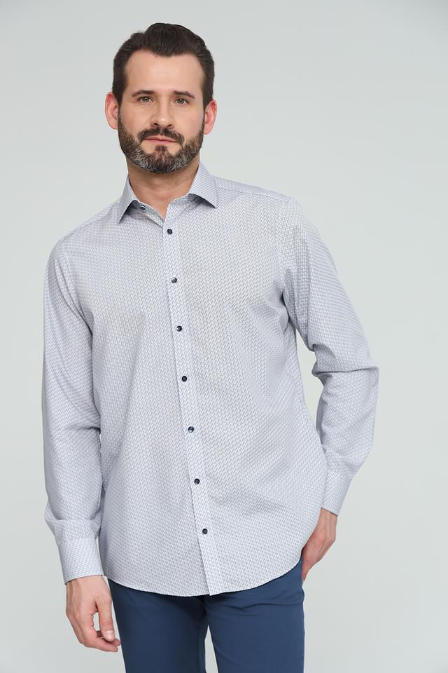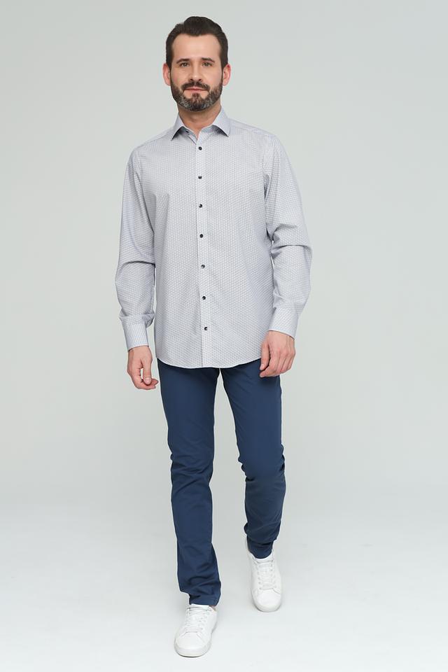 Рубашка имеет классический крой, длинные рукава и стандартную воротничковую стойку. Особенностью модели является стильный геометрический принт, выполненный в серых тонах. Застежка на пуговицах по всей длине переда.