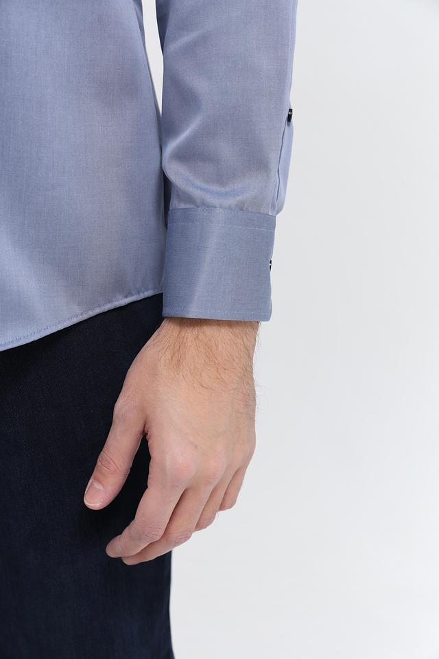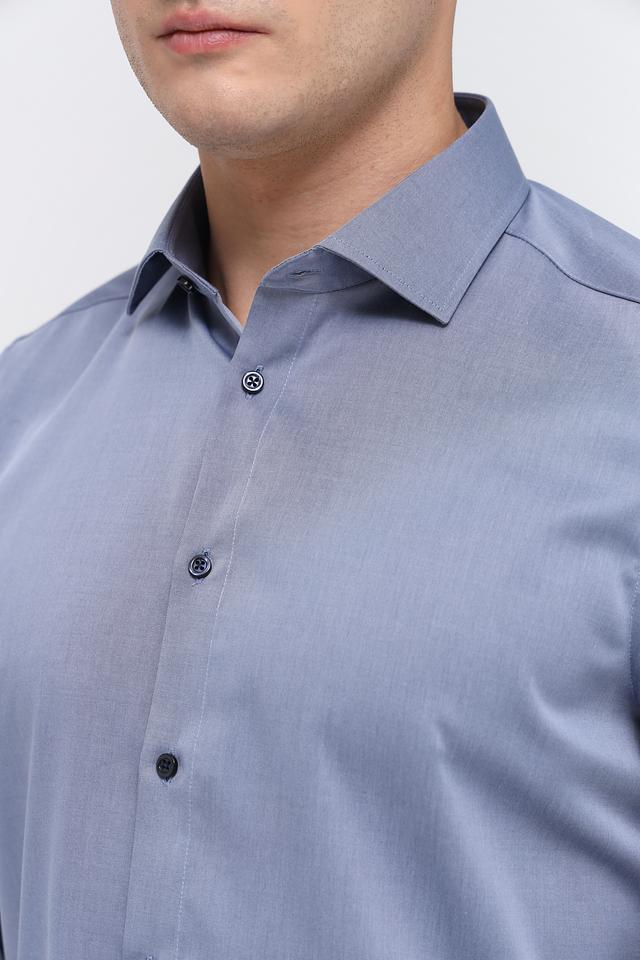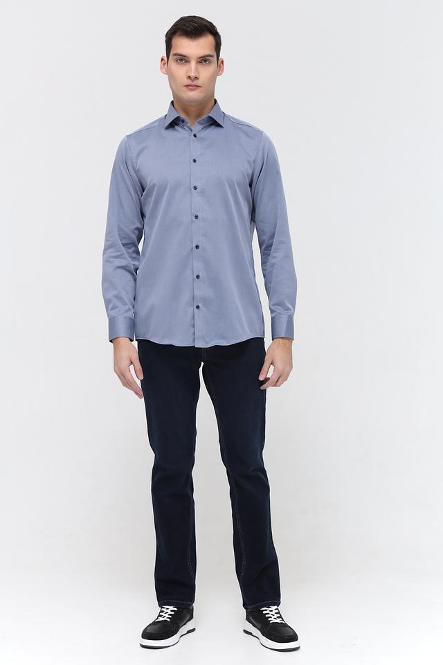 Рубашка имеет классический крой с длинными рукавами и приталенный силуэт, который подчеркивает фигуру. Застежка на пуговицах по всей длине обеспечивает удобство надевания и снятия. Воротник рубашки классической формы.
