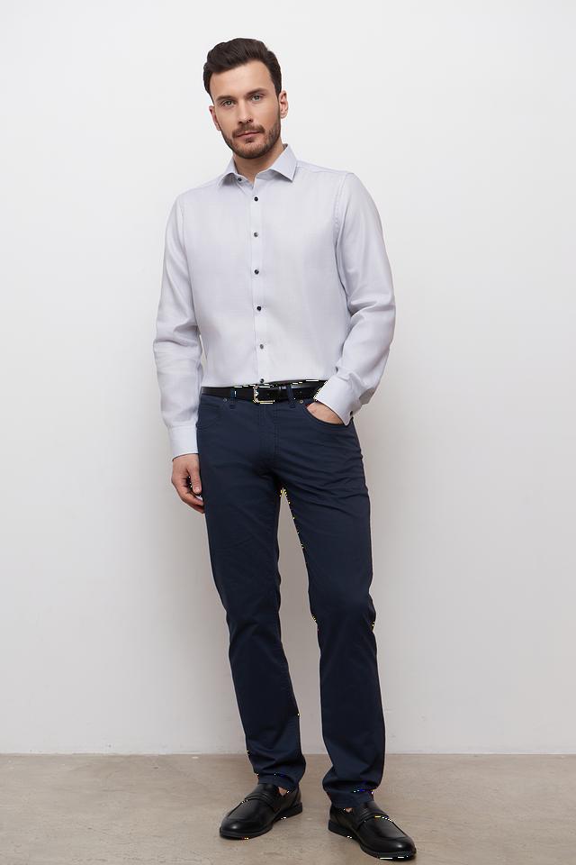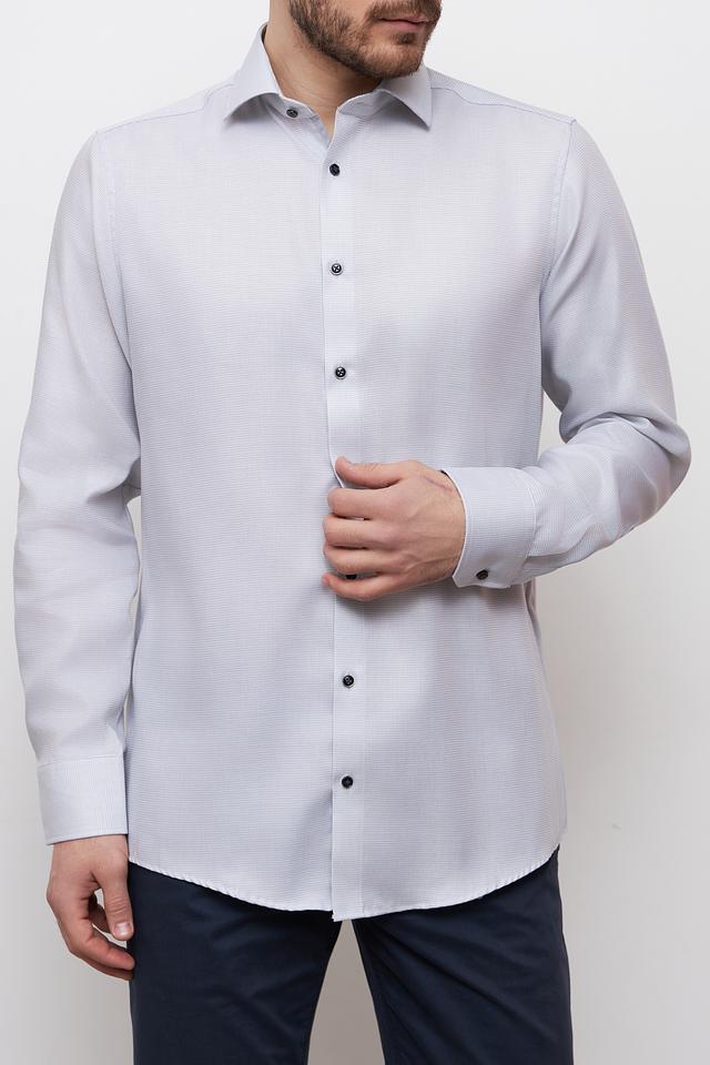 Рубашка имеет классический крой, который обеспечивает комфортную посадку по фигуре. Длинные рукава и аккуратный воротник делают ее подходящей для любого случая. Застежка на пуговицы выполнена в тон рубашки, что придает ей элегантный вид.