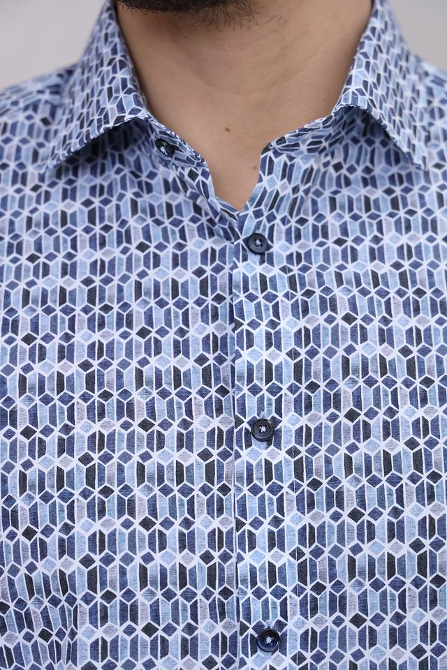 Особенностью данной модели является оригинальный геометрический принт, выполненный в сочетании голубых и тёмно-синих оттенков. Этот принт добавляет рубашке современный и стильный вид, делая ее подходящей как для повседневной носки, так и для более формальных мероприятий.