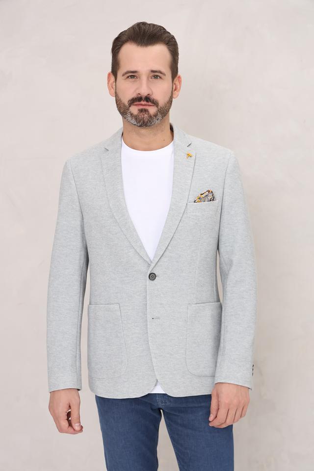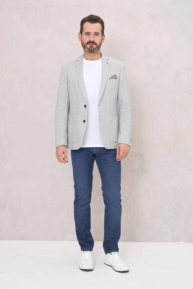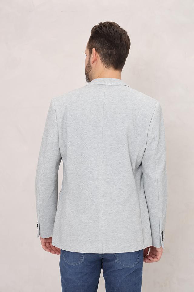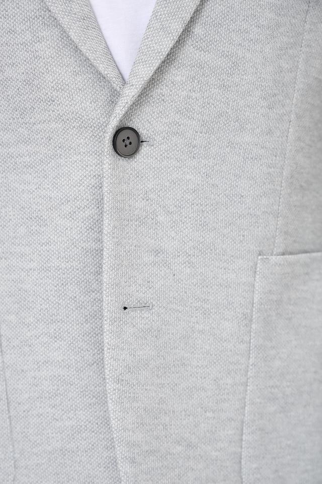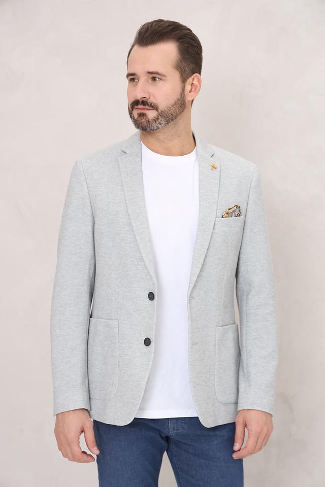 Пиджак имеет приталенный крой, который подчеркивает фигуру. Застежка на две пуговицы. Накладные карманы добавляют практичности. Отличительной особенностью является текстура ткани, напоминающая трикотаж.