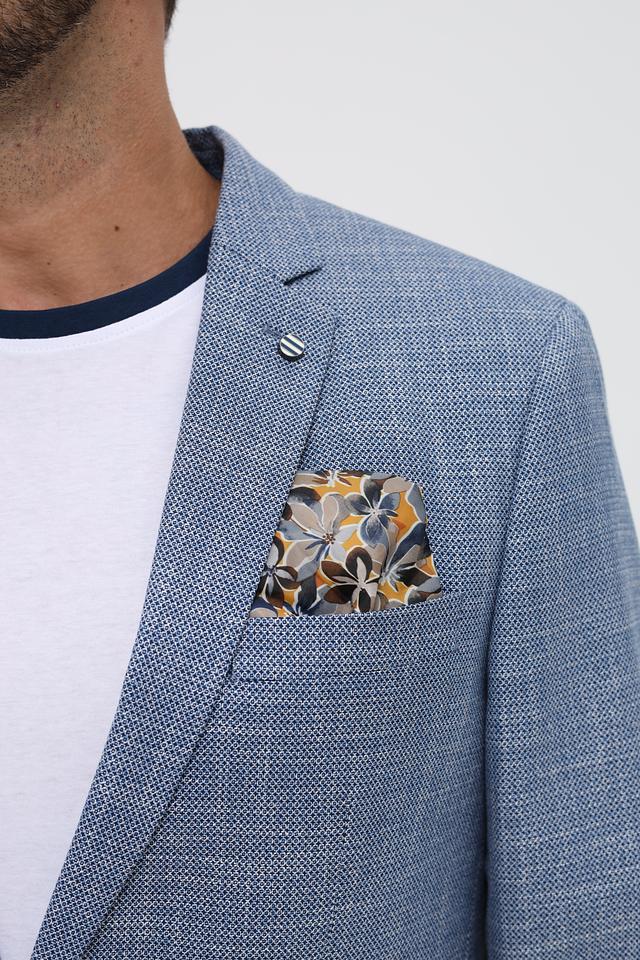 Состав ткани включает вискозу, полиэстер и эластан, что обеспечивает приятные тактильные ощущения, хорошую воздухопроницаемость и устойчивость к сминанию. В комплекте с пиджаком идет нагрудный платок с цветочным принтом, который добавляет образу изысканности и индивидуальности.