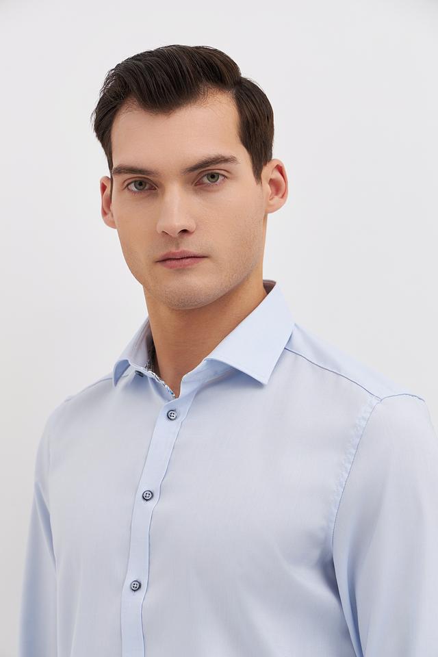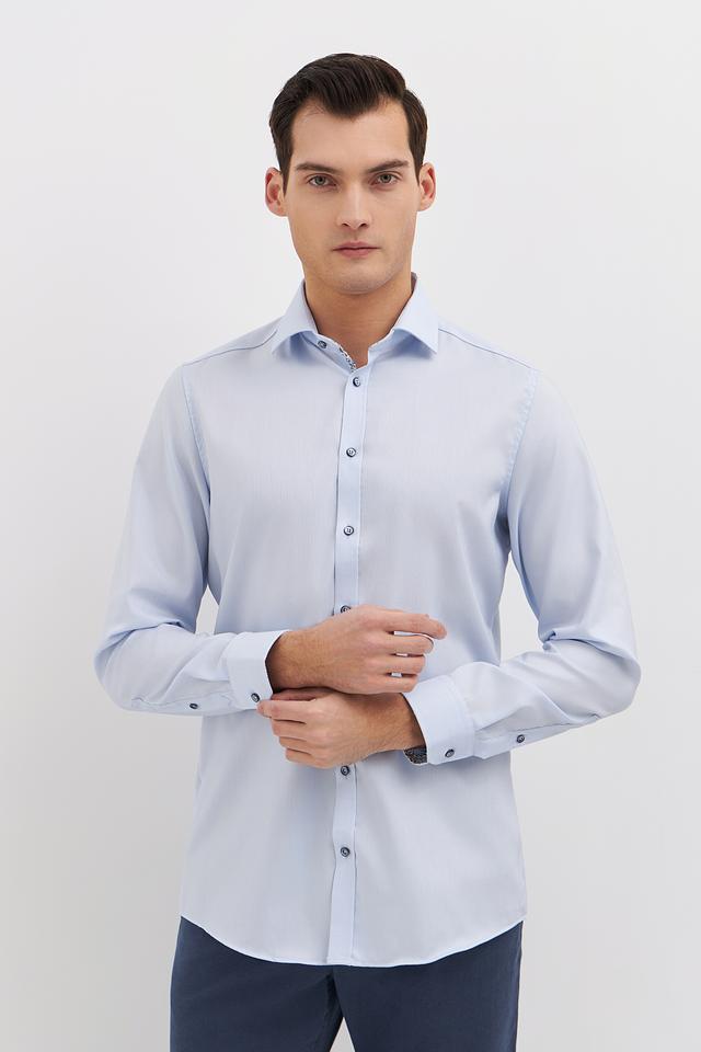 Рубашка имеет классический крой с длинными рукавами и стандартной посадкой. Воротник рубашки выполнен в классическом стиле. Застежка на пуговицах обеспечивает надежную фиксацию.
