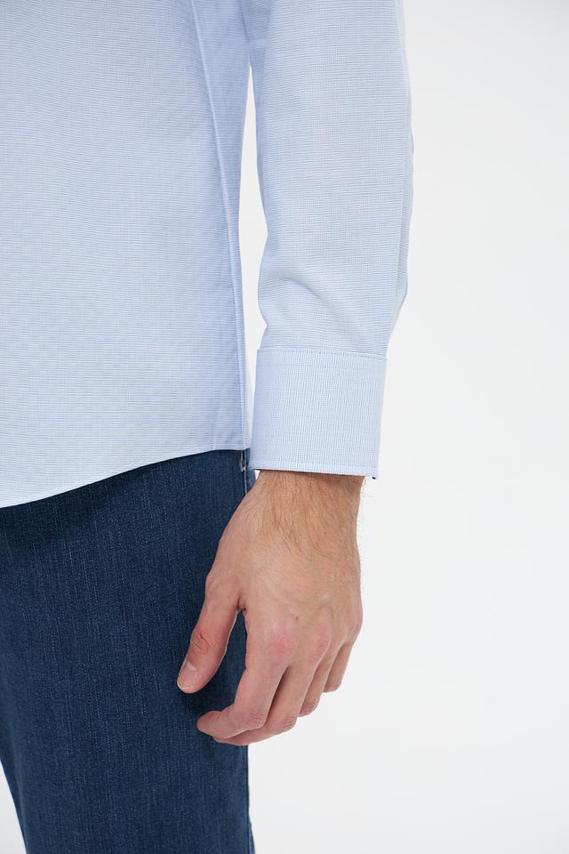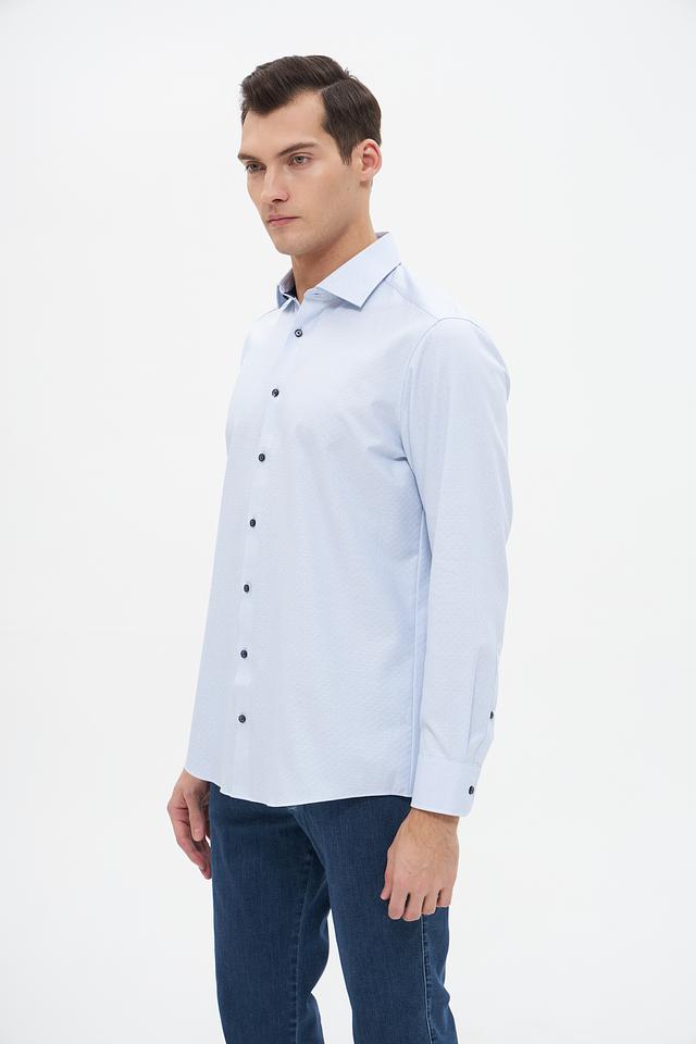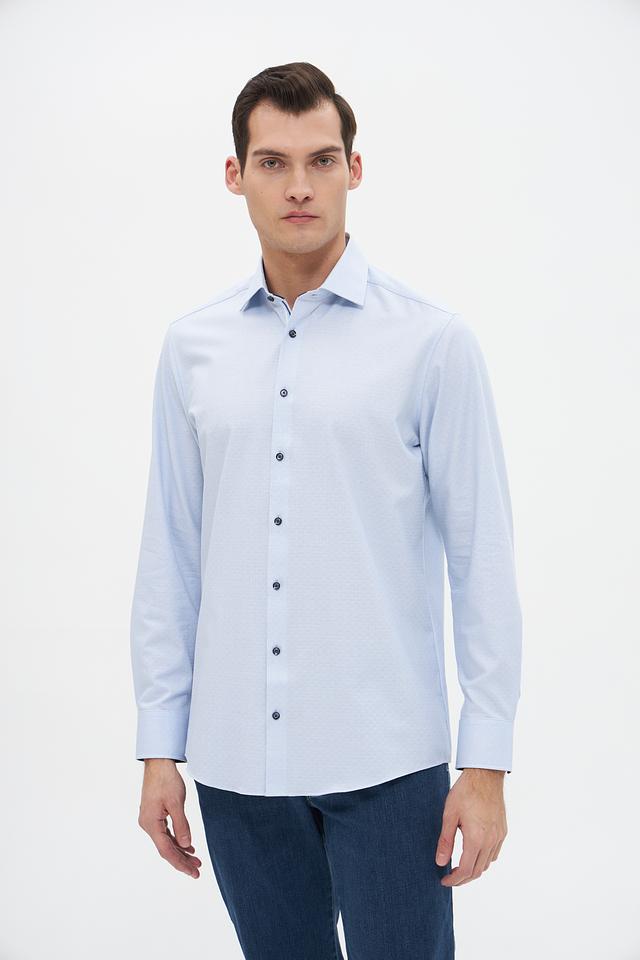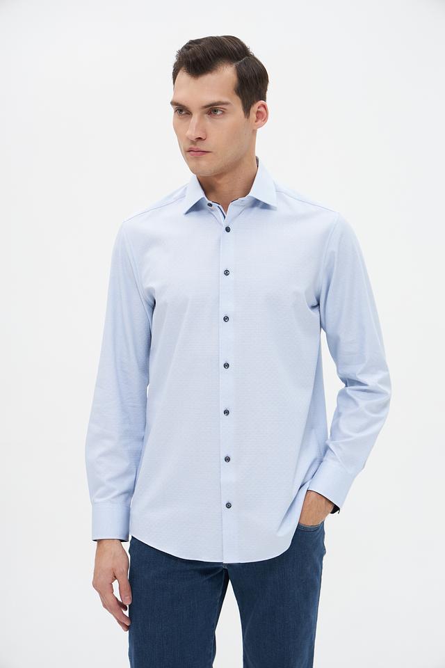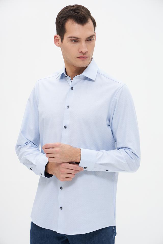 Рубашка имеет классический крой с приталенным силуэтом, что обеспечивает комфортную посадку по фигуре. Длинные рукава с манжетами на пуговицах позволяют регулировать их длину. Воротник рубашки классической формы, идеально подходит для ношения с галстуком или без него.