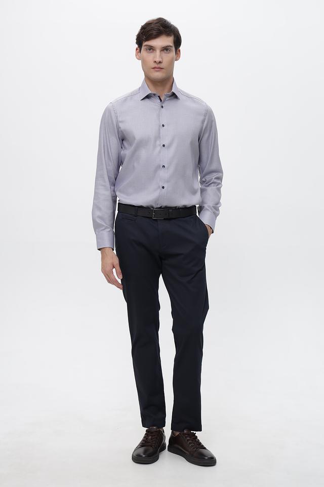 Рубашка имеет классический крой с длинными рукавами и приталенный силуэт. Застежка на пуговицы по всей длине. Воротник рубашки классической формы.