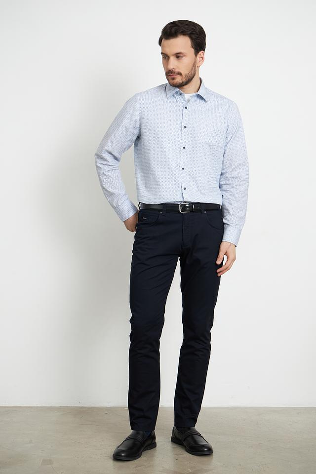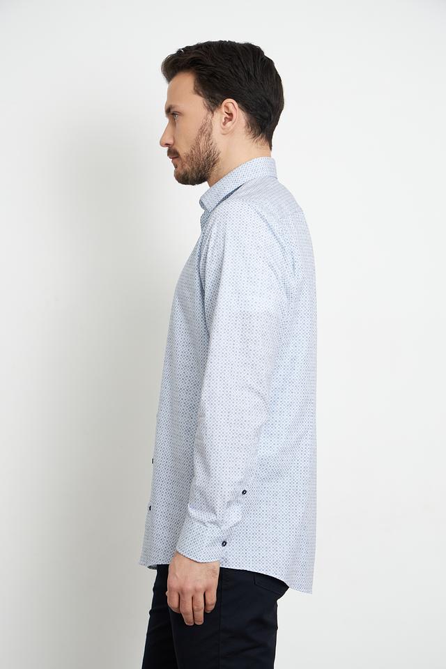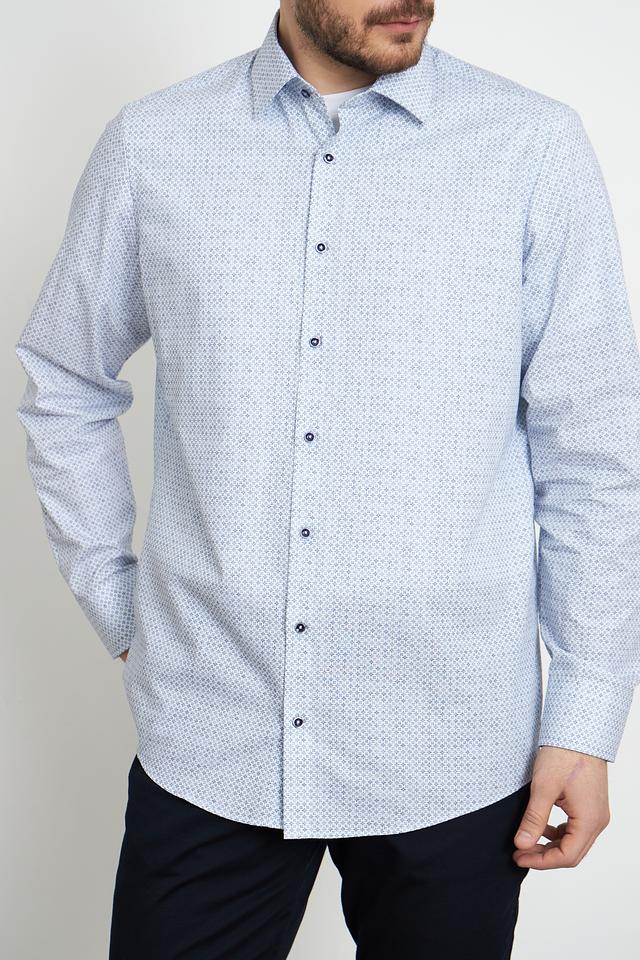 Рубашка имеет классический крой с длинными рукавами и стандартным воротником. Особенностью модели является мелкий геометрический рисунок, выполненный в голубых и белых тонах, который придает ей изысканность и оригинальность.