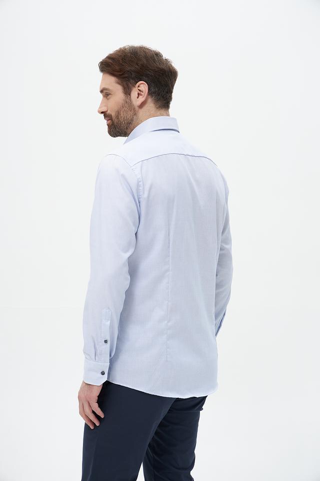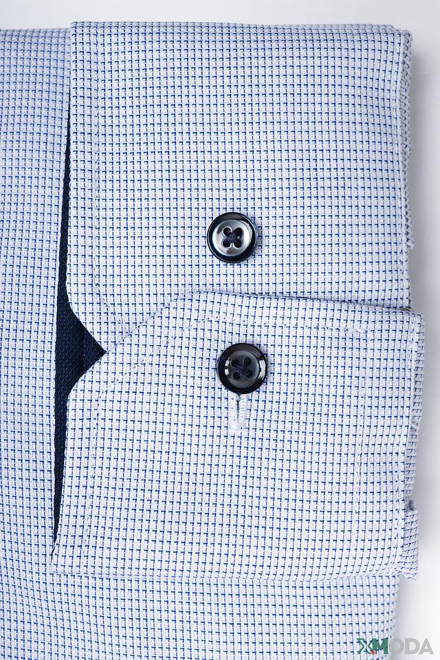 Рубашка имеет классический крой, длинные рукава и воротник с небольшим разворотом. Застежка на пуговицы по всей длине. Отличительной особенностью является деликатный рисунок в тонкую полоску, который придает рубашке элегантный вид.