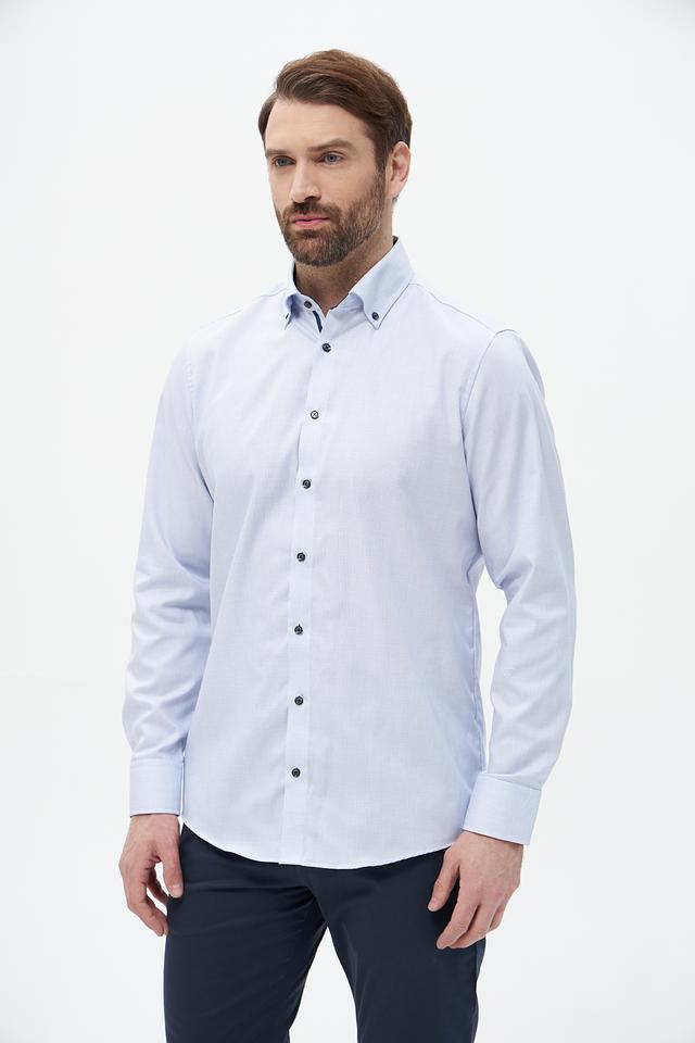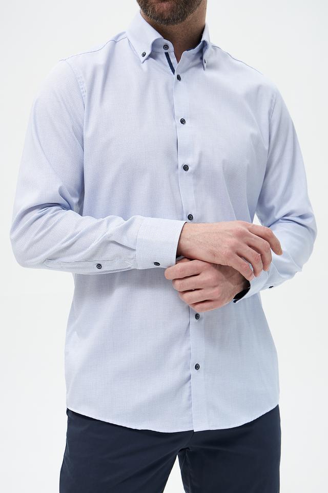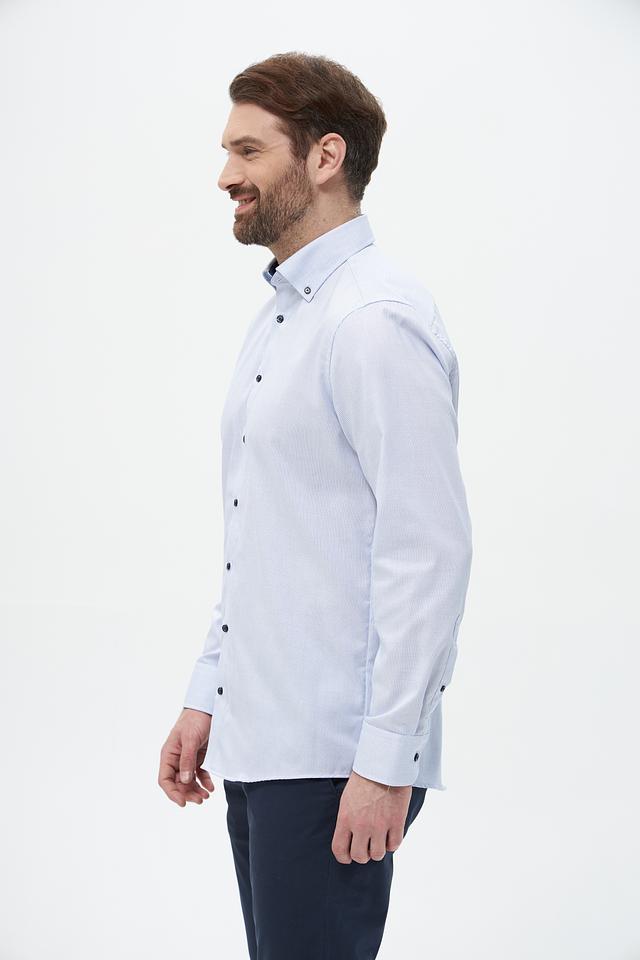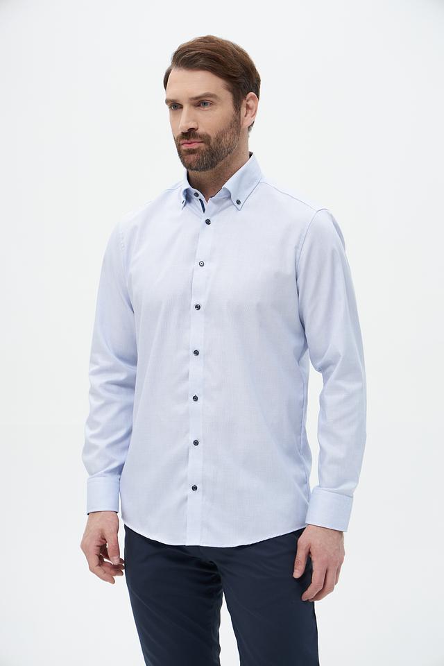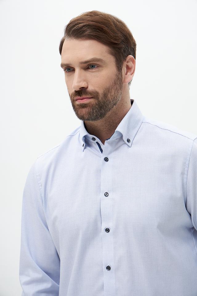 Цвет рубашки – светло-голубой, спокойный и универсальный, легко сочетается с различными брюками и джинсами. Она идеально подходит для офиса, деловых встреч или повседневной носки. Состав: 100% хлопок.