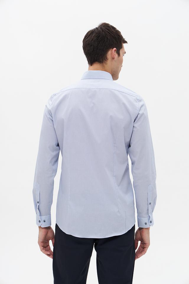 Рубашка имеет классический крой, длинные рукава и приталенный силуэт. Воротник рубашки выполнен в классическом стиле. Застежка на пуговицах по всей длине. На манжетах также предусмотрены пуговицы.