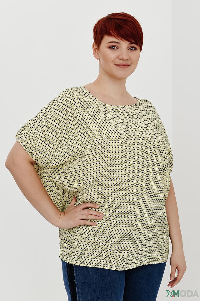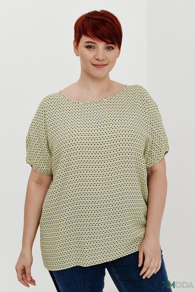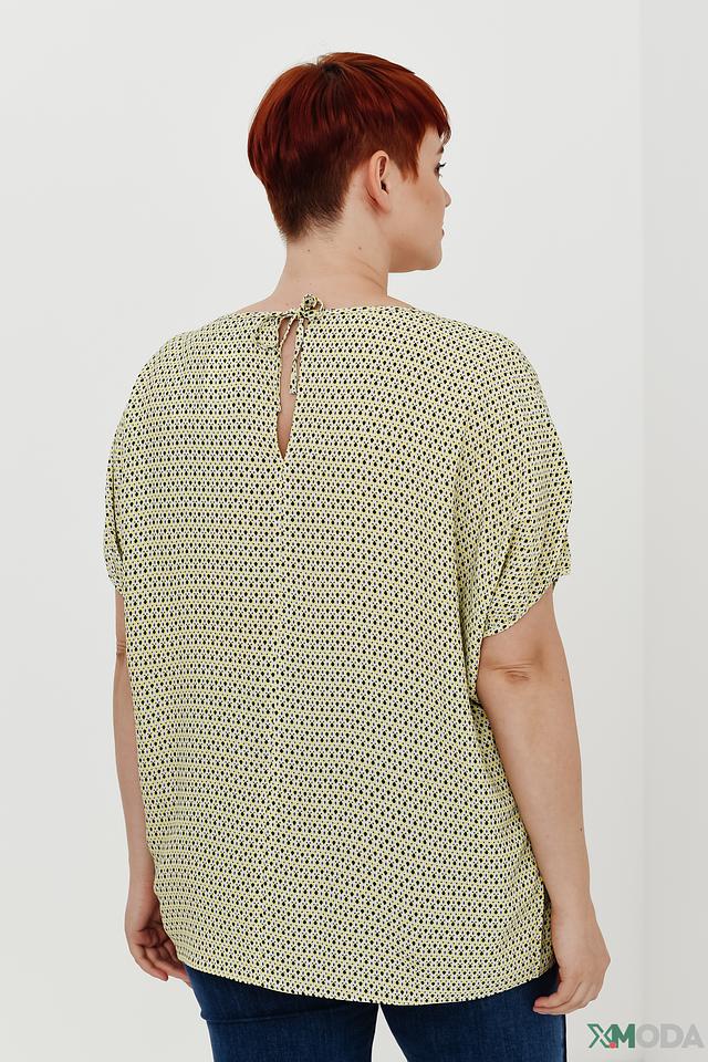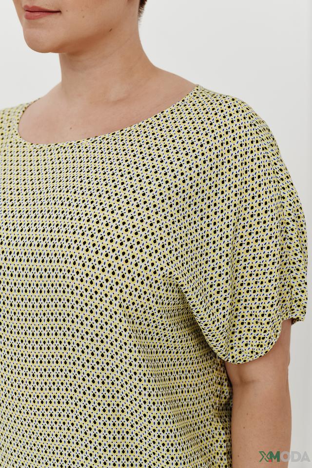 Особенностью данной модели является оригинальный принт в тёмных тонах на светло-жёлтом фоне. Вырез горловины округлый, а на спине предусмотрена небольшая V-образная выемка с завязками. Эта блуза идеально подойдёт для создания как повседневных, так и более нарядных образов.