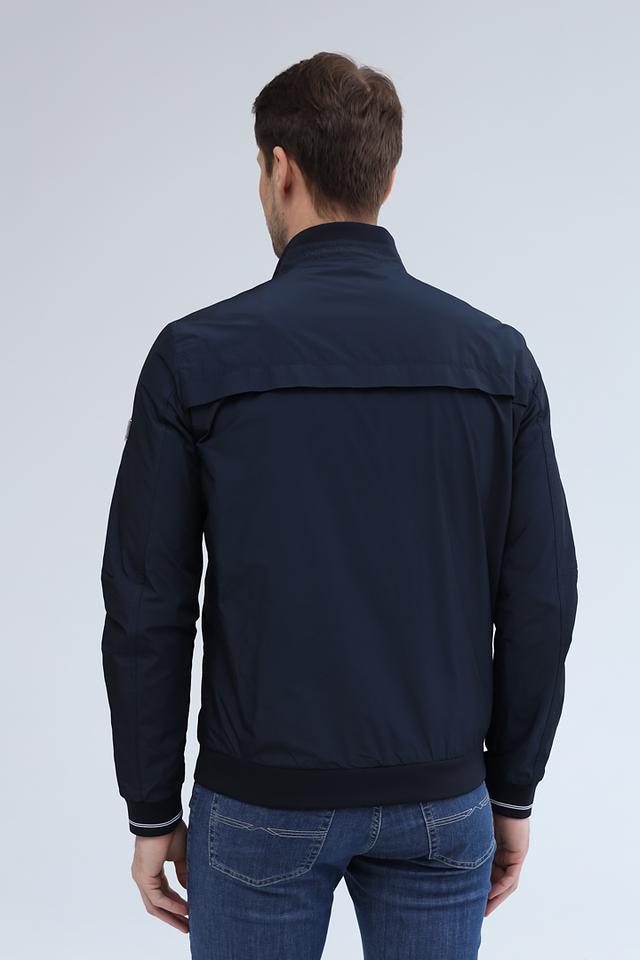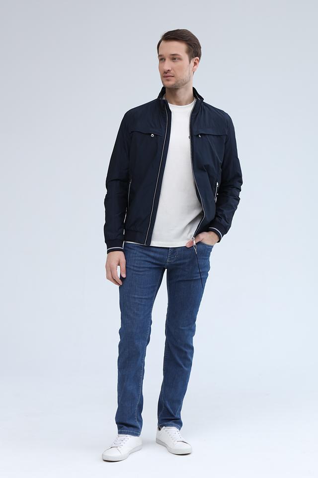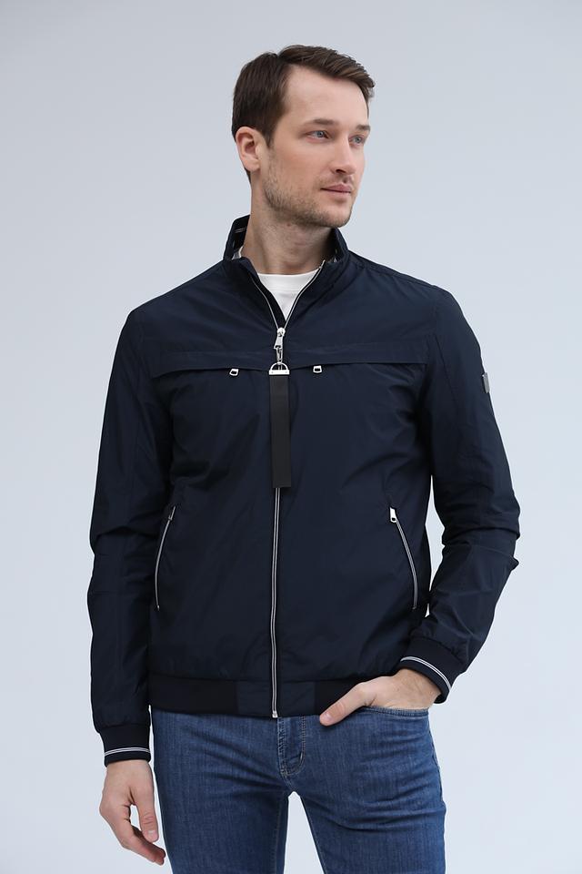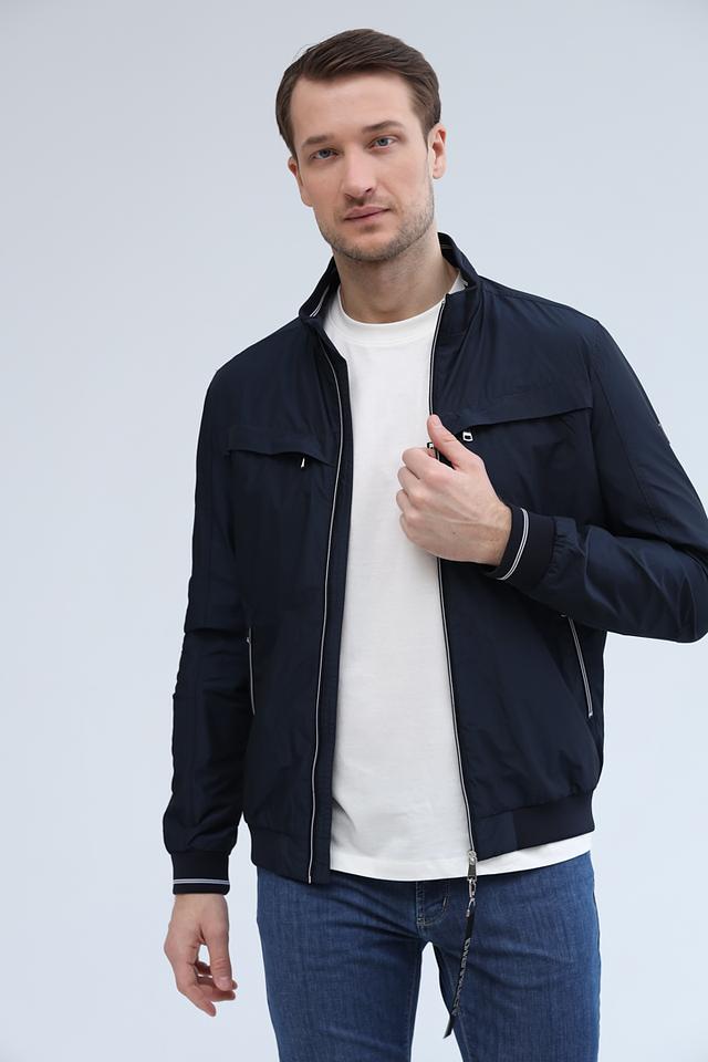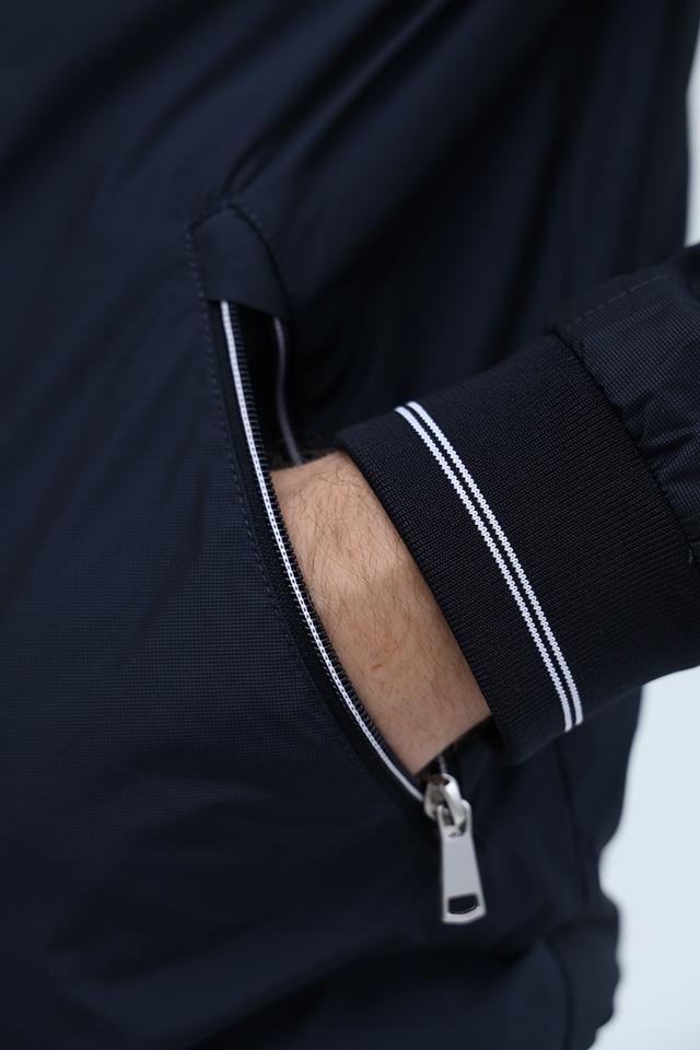 Куртка имеет классический крой, воротник-стойку и застёжку-молнию. На рукавах и по низу куртки – эластичная белая полоса, добавляющая динамики образу. Два боковых кармана на молнии обеспечивают удобное хранение необходимых мелочей.