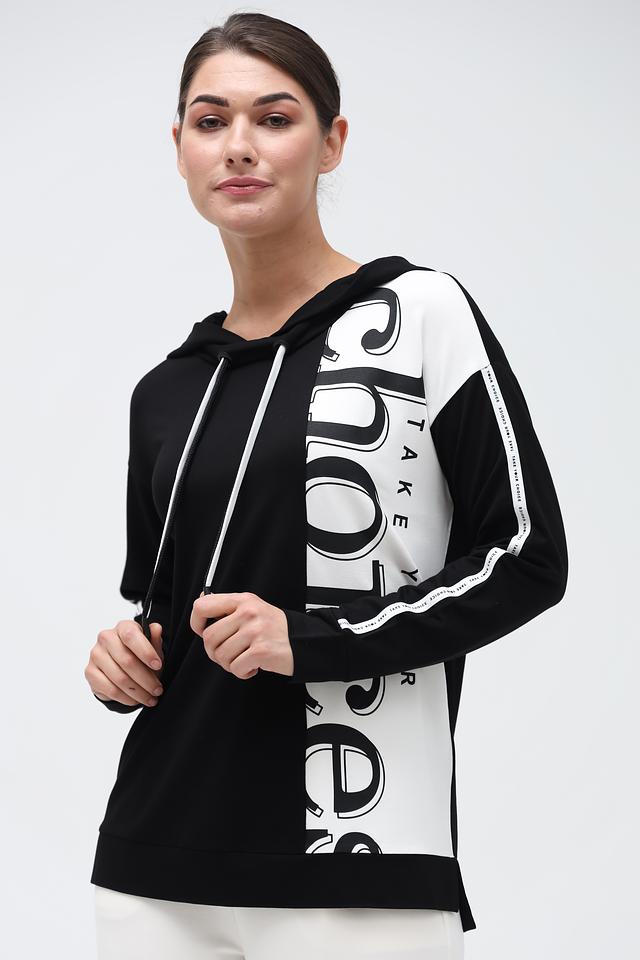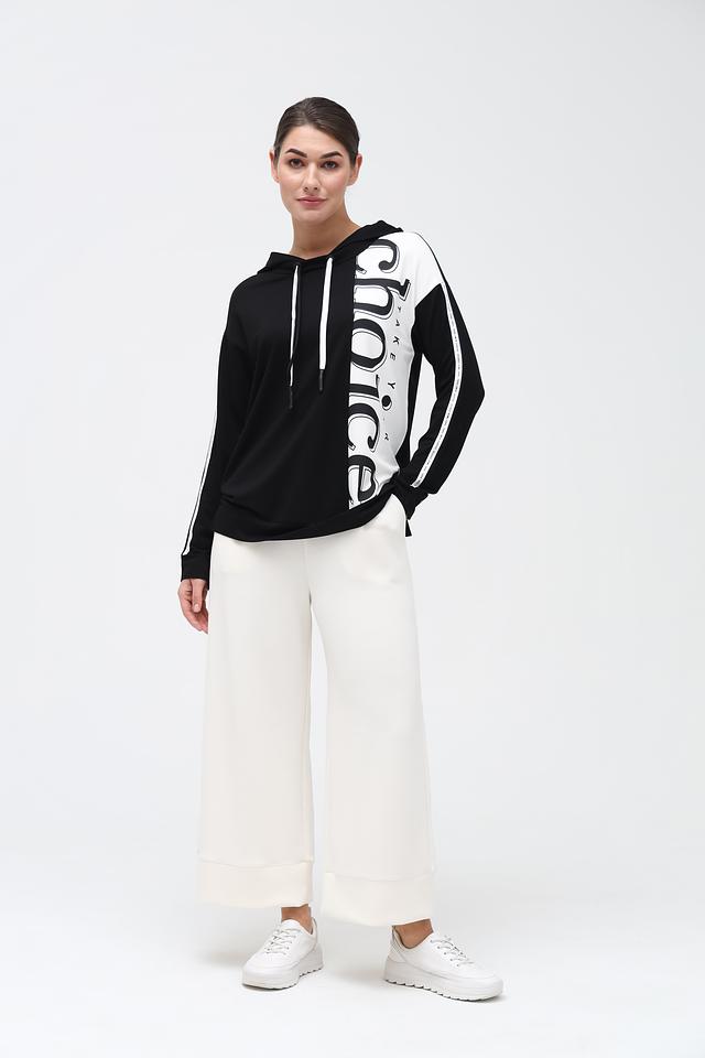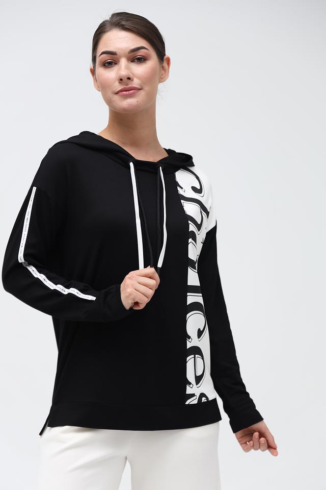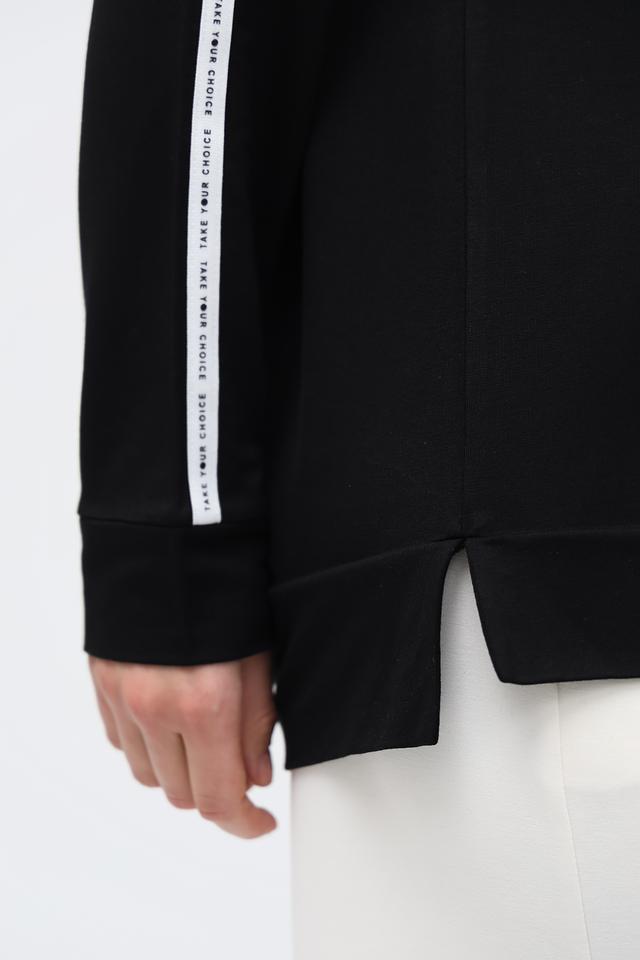 Чёрная толстовка от Via Appia с оригинальным белым принтом и белыми полосами на рукавах. Модель выполнена из мягкой вискозы с добавлением эластана, обеспечивающего комфортную посадку. Состав: вискоза 95%, эластан 5%