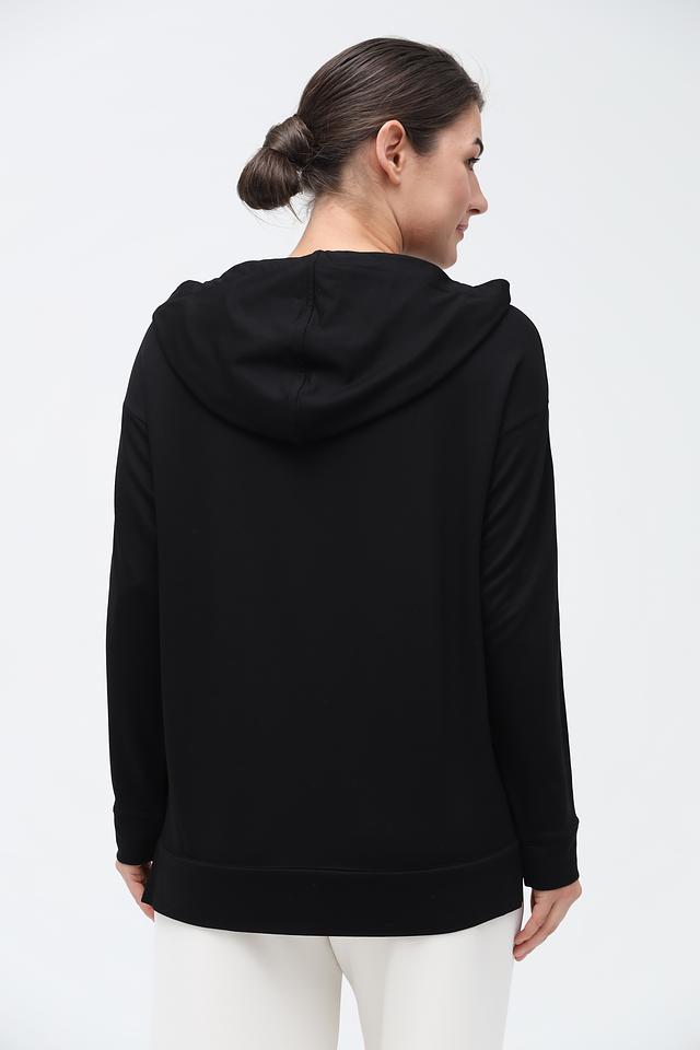 Модель имеет удобный капюшон и свободный крой, что обеспечивает максимальный комфорт в носке. Белые полосы на рукавах добавляют динамичности образу. Толстовка изготовлена из высококачественной вискозы с добавлением эластана, благодаря чему она приятна к телу, хорошо держит форму и не сковывает движений.