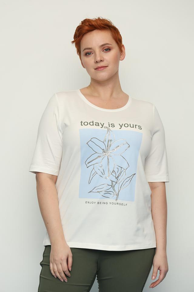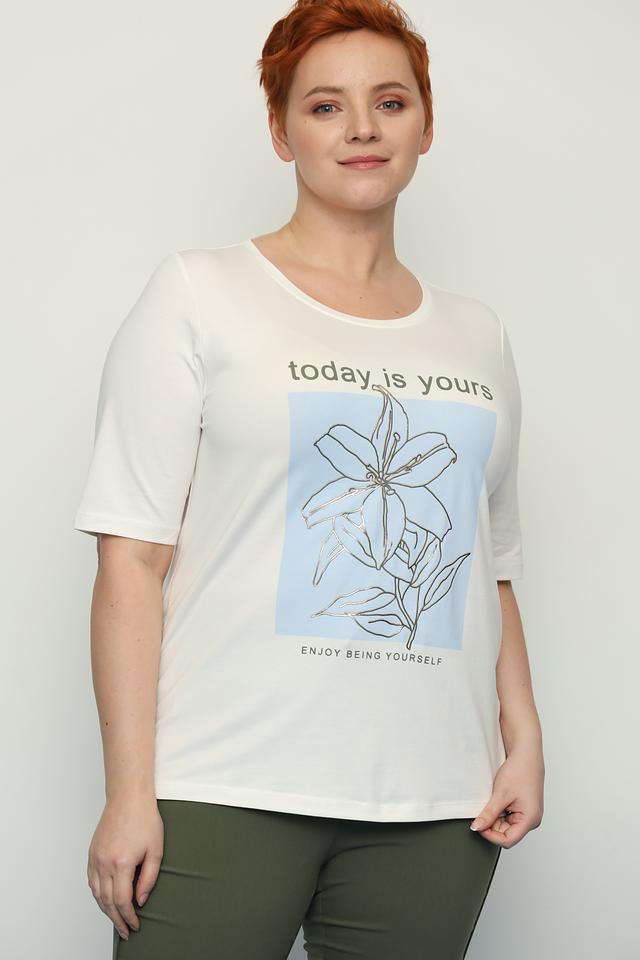 Белая футболка Via Appia с коротким рукавом и ярким цветочным принтом. Изготовлена из мягкого и приятного к телу сочетания хлопка, модала и эластана, обеспечивающего комфорт при носке. Состав: хлопок 47%, модал 47%, эластан 6%