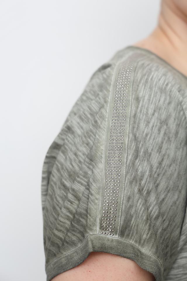 Модель имеет свободный крой, короткие рукава и круглый вырез горловины. По бокам футболки расположены небольшие шнурки, которые позволяют регулировать посадку и создавать более женственный силуэт. Рукава слегка приспущены, что придает футболке расслабленный вид.