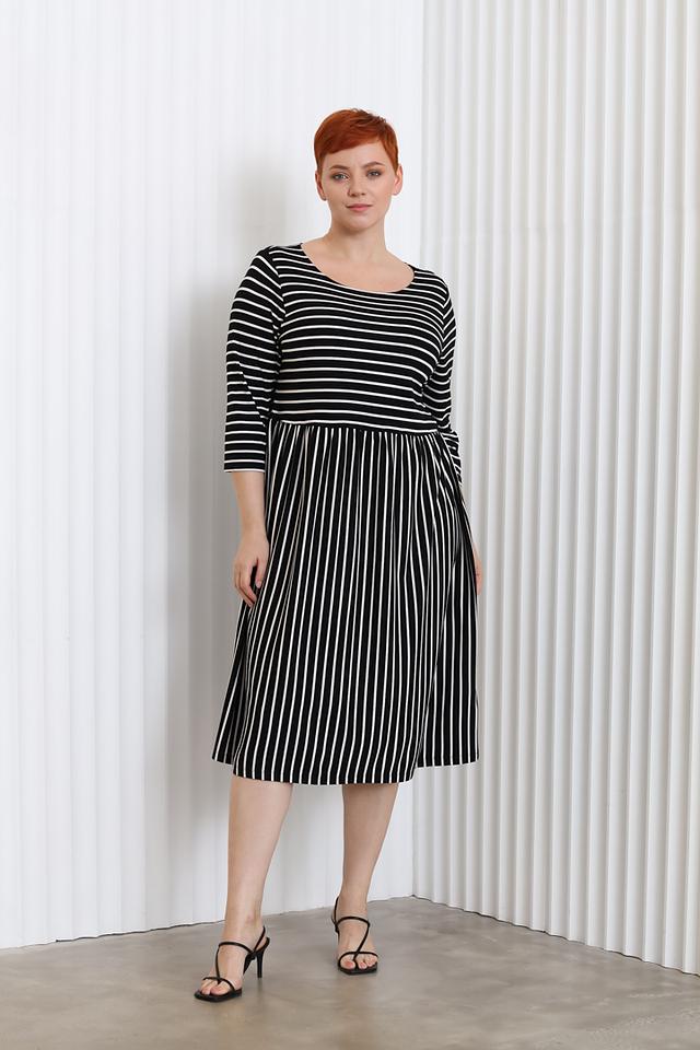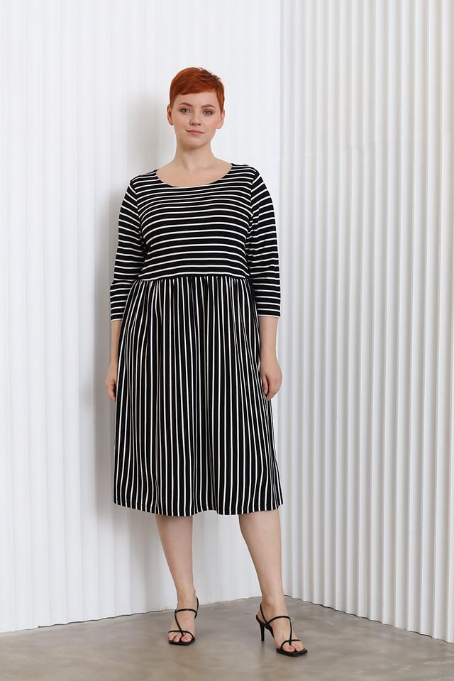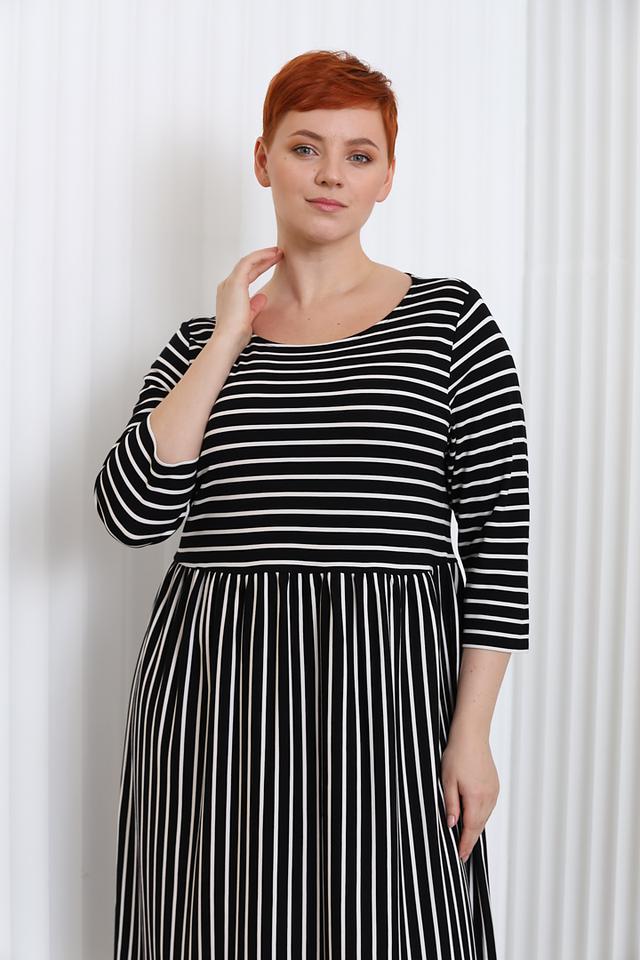 Это платье от Via Appia – идеальный выбор для тех, кто ценит комфорт и стиль. Модель выполнена в классическую чёрно-белую полоску, которая визуально стройнит и подходит практически к любому типу внешности.