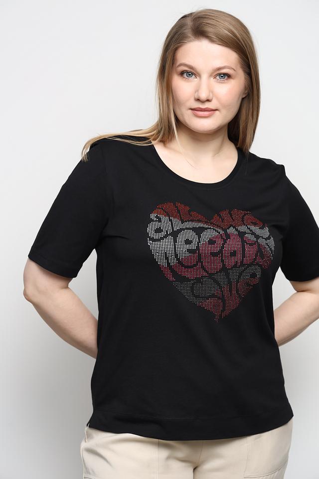 Чёрная футболка Via Appia с ярким принтом в виде сердца, выполненным из страз. Изготовлена из мягкого и приятного к телу сочетания хлопка и модала, обеспечивая комфорт в носке. Состав: хлопок 50%, модал 50%