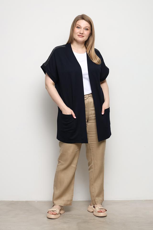 Модель имеет свободный крой, короткие рукава и открытый фасон, что делает его удобным и практичным. Декоративная отделка на плечах придает кардигану изысканность и оригинальность.