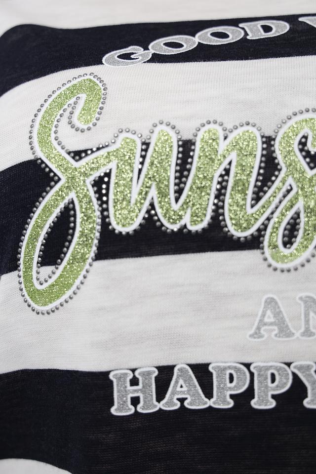 Передняя часть футболки украшена эффектным принтом с надписью "Sunshine and Happy Mind", выполненным в сочетании золотистого и белого цветов, с декоративной отделкой стразами. Крой футболки свободный, прямой силуэт, что обеспечивает комфортную посадку по фигуре.