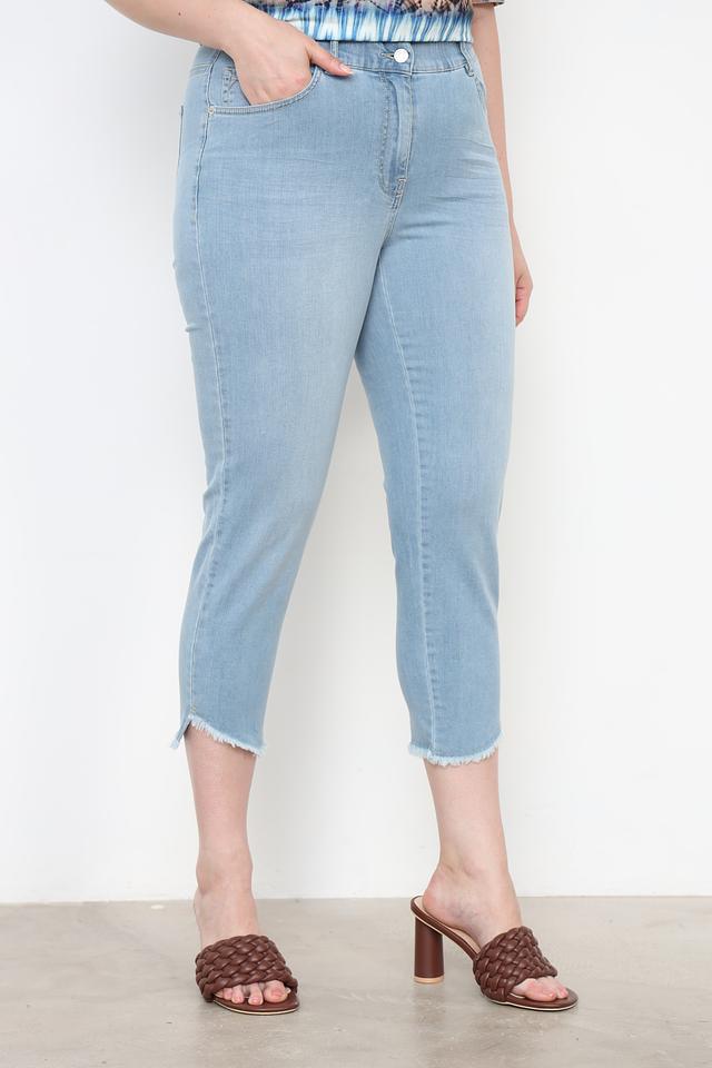 Джинсы имеют укороченный крой, который идеально подходит для создания модных образов в тёплое время года. Эластичный пояс обеспечивает комфортную посадку по фигуре, не стесняя движений. Классическая застёжка на пуговицу и молнию дополняет функциональность модели.