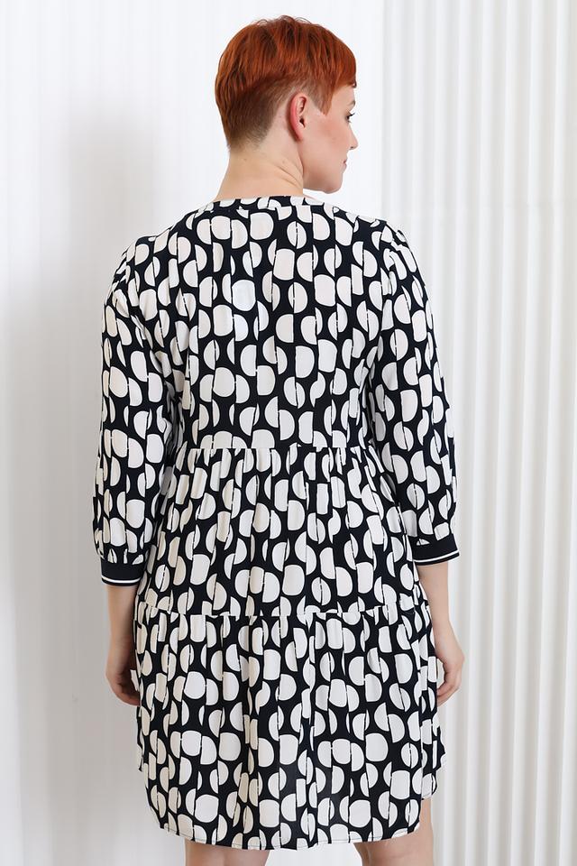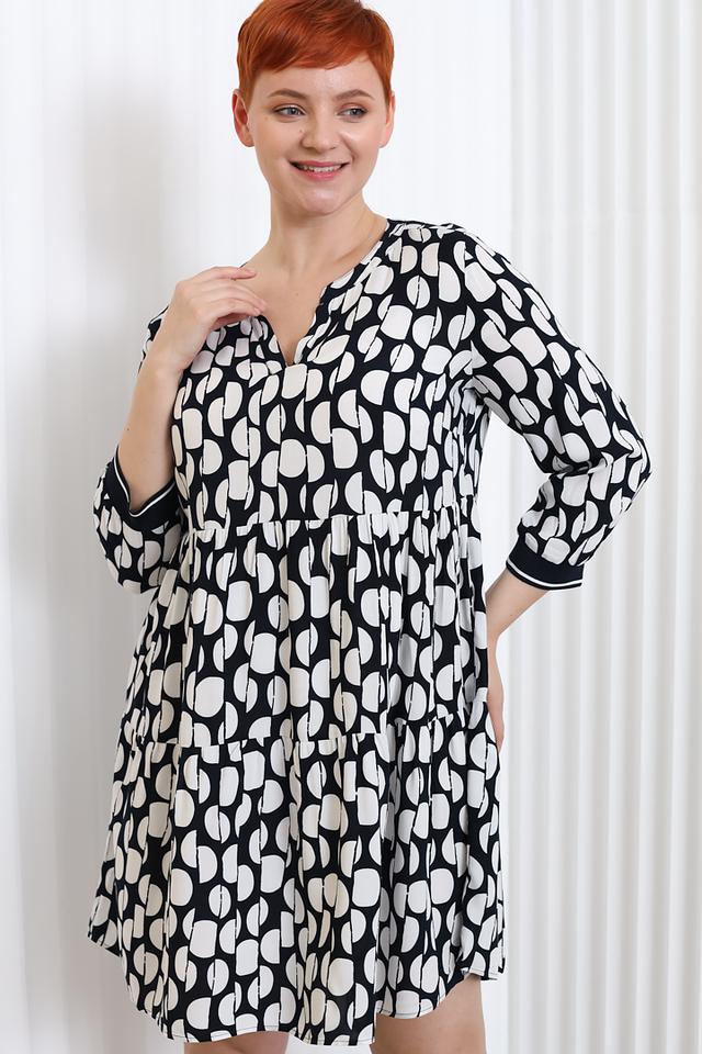 Платье имеет оригинальный принт в горошек, сочетающий в себе чёрный и белый цвета. V-образный вырез горловины и рукава длиной 3/4 с манжетами придают модели элегантность и женственность.