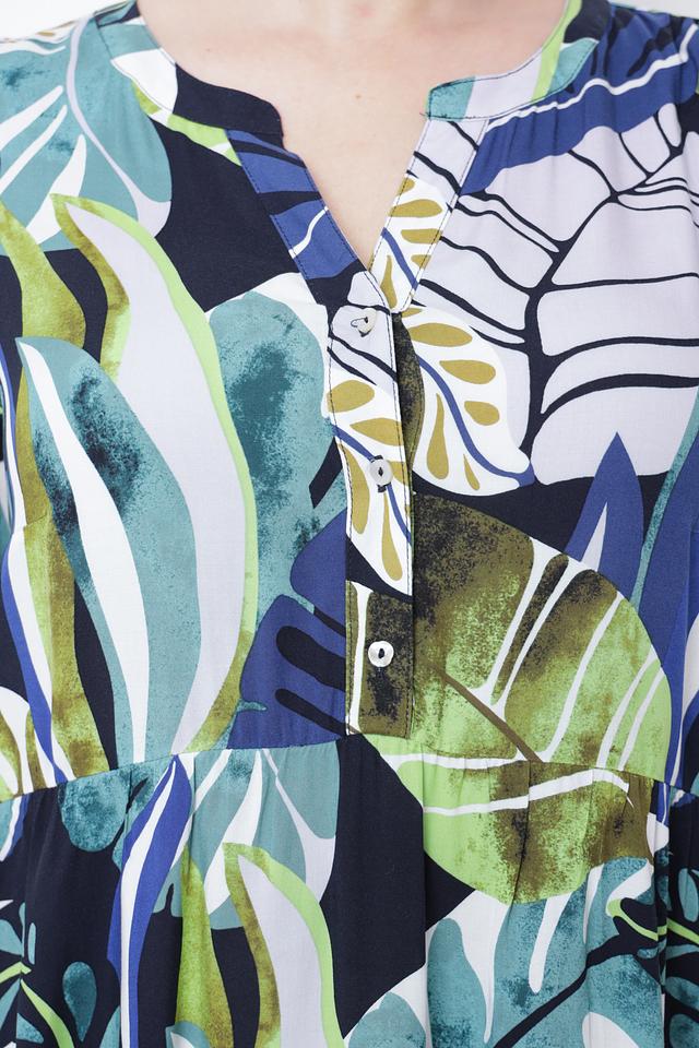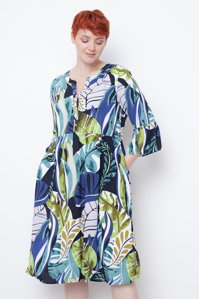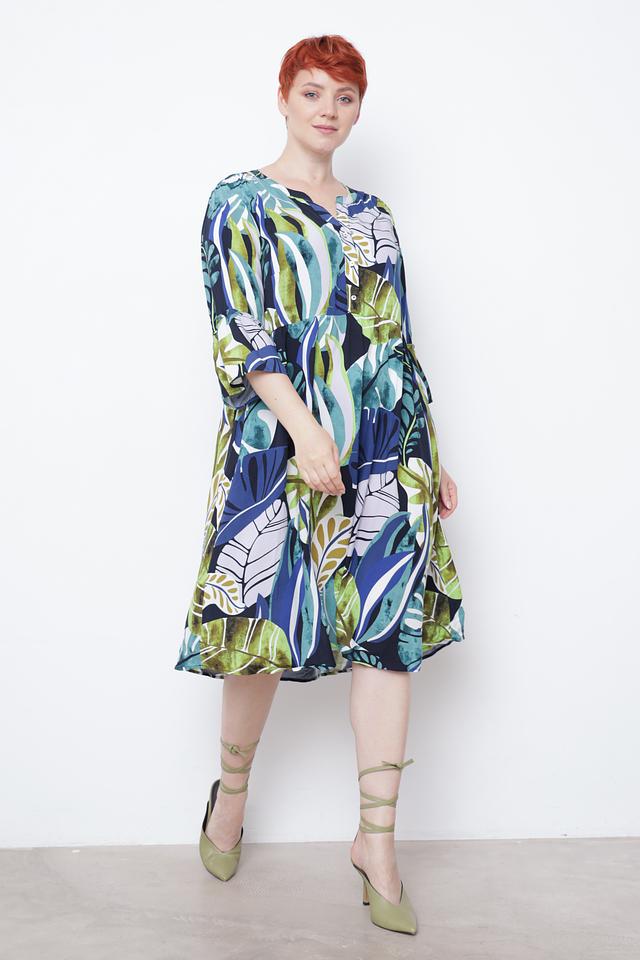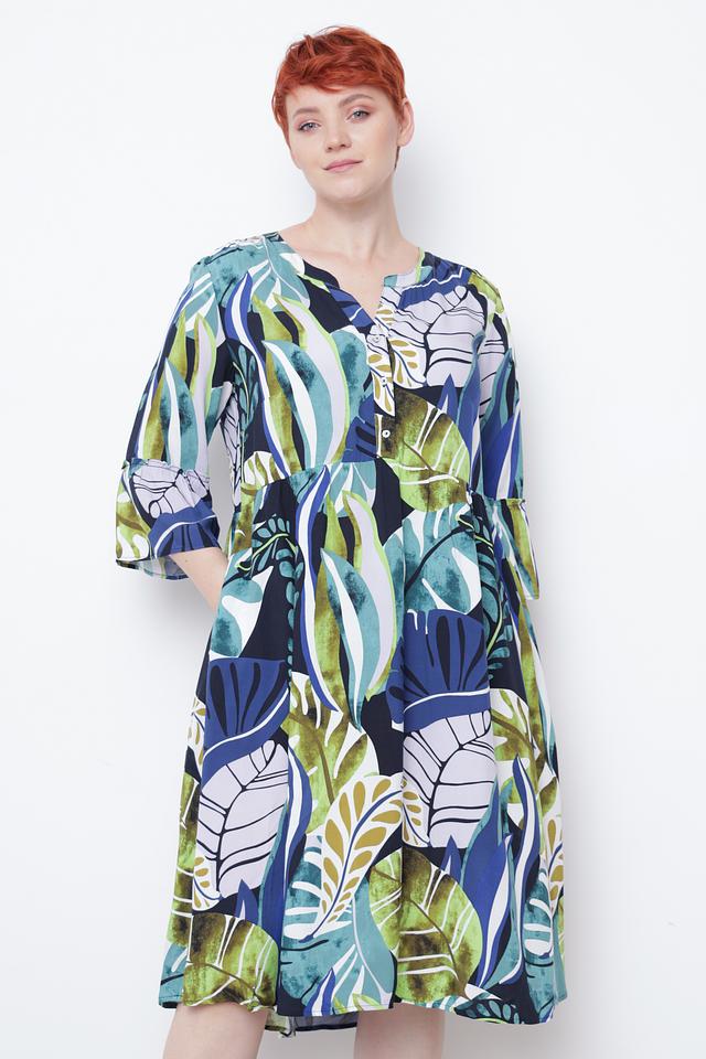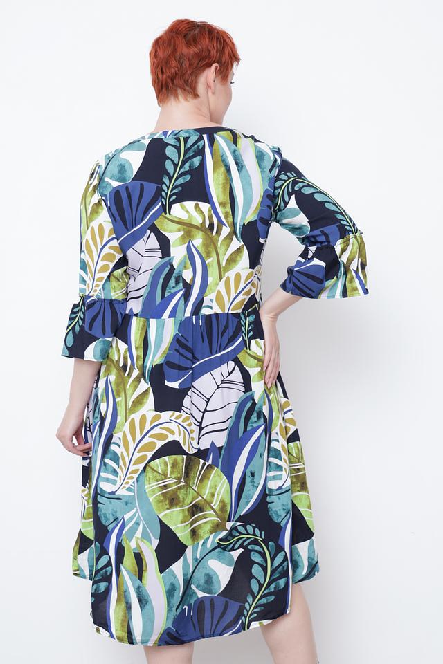 Модель отличается оригинальным тропическим принтом, сочетающим в себе оттенки зелёного, синего и белого. V-образный вырез горловины и рукава 3/4 со сборкой придают платью женственность и лёгкость. Приспущенная талия и расклешённый силуэт делают его идеальным для любого типа фигуры.