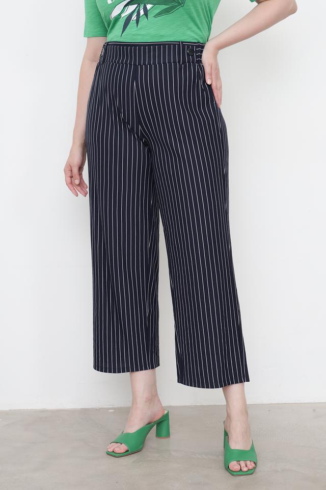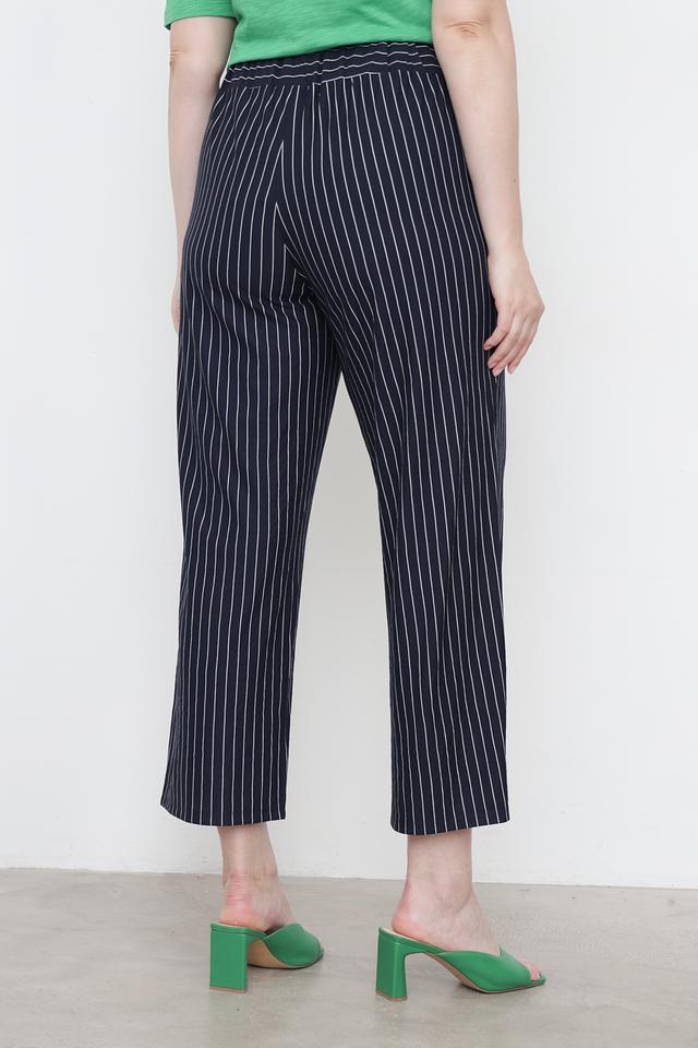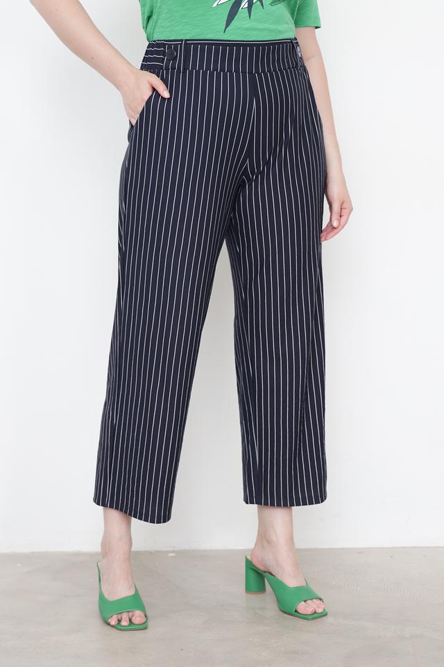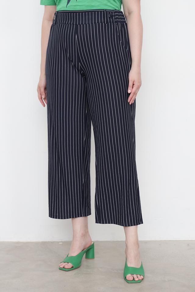 Дизайн брюк представлен в виде вертикальной полоски тёмно-синего и белого цветов. Завышенная талия визуально удлиняет ноги и подчеркивает силуэт. Широкие штанины обеспечивают свободу движений и создают современный образ. Брюки застегиваются на молнию и пуговицу, а также имеют боковые карманы.