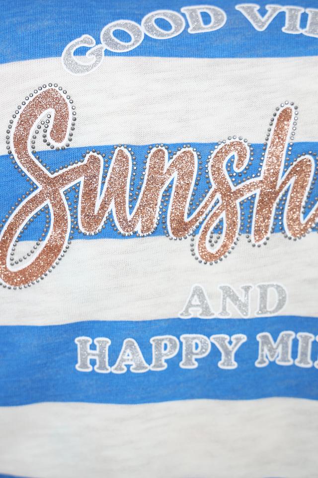 На передней части футболки расположен яркий принт с надписью "Sunshine and Happy Mind", выполненный в золотистых тонах, что добавляет образу позитива и оригинальности.