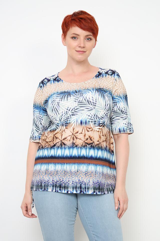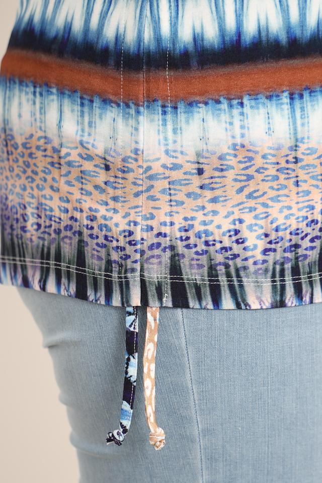 Особенностью этой модели является яркий и оригинальный принт в стиле тай-дай, сочетающий в себе различные оттенки синего, коричневого и бежевого цветов. Такой рисунок добавит вашему образу индивидуальности и неповторимости. Состав: вискоза 96%, эластан 4%.