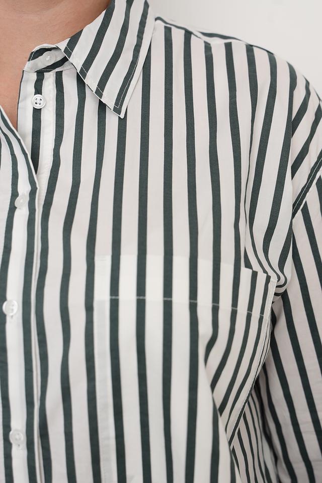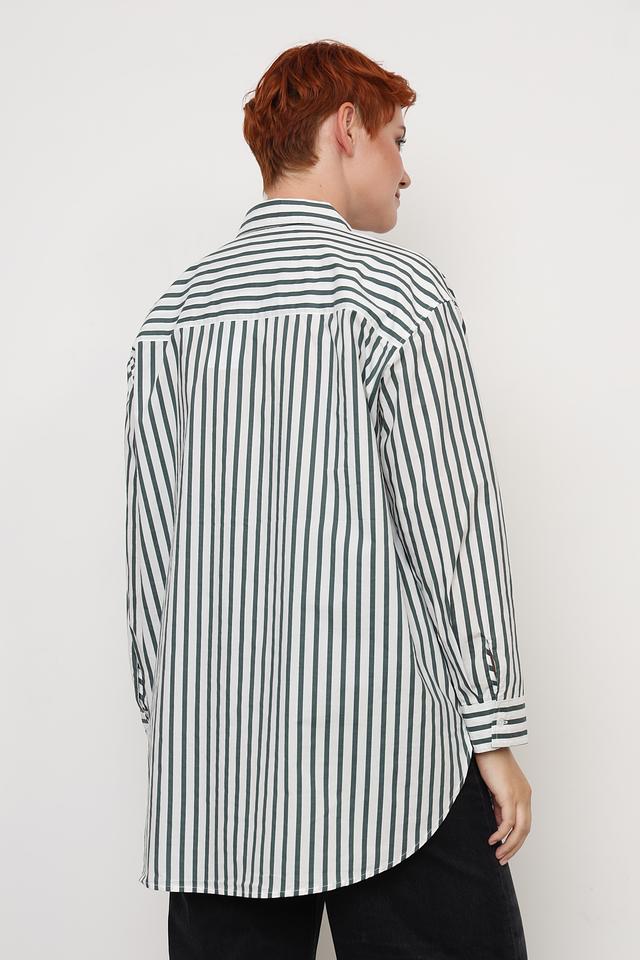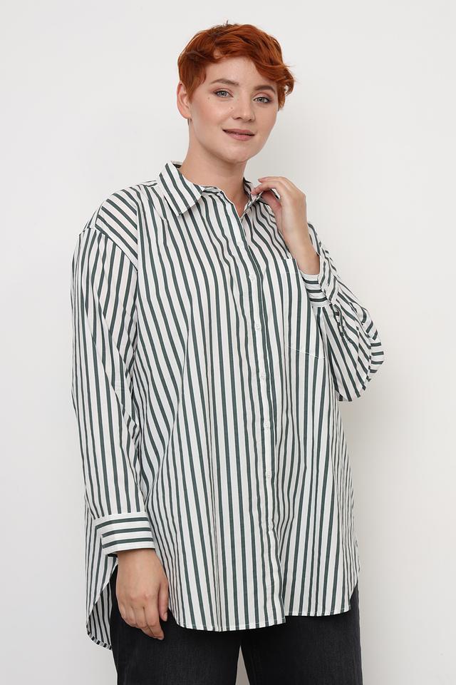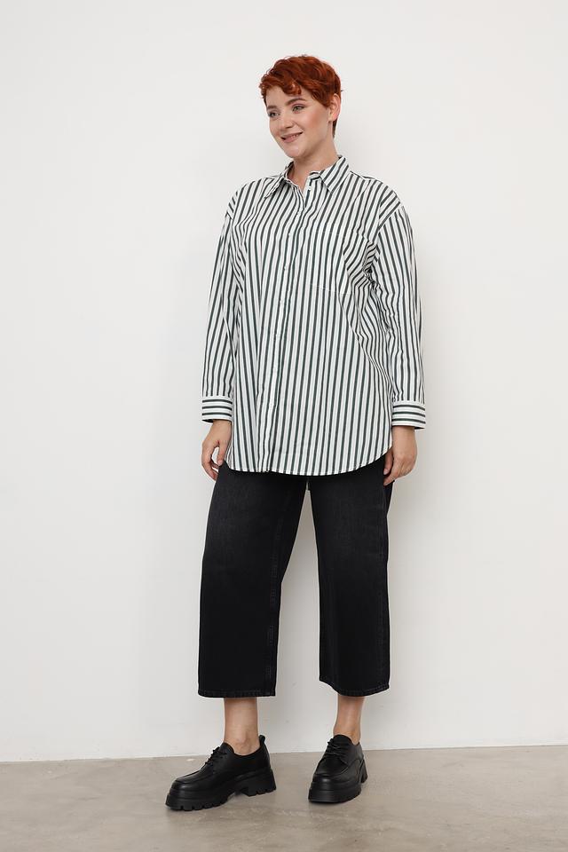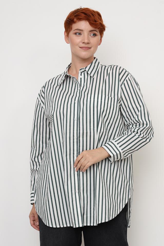 Рубашка имеет прямой крой, длинные рукава с манжетами на пуговицах и классический отложной воротник. Застежка на пуговицах по всей длине. Модель отличается свободным силуэтом, что обеспечивает комфорт при носке.